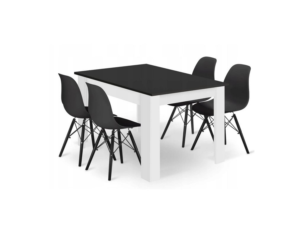 Jedálenská súprava OSAKA v čierno-bielej kombinácii je ideálnym riešením pre moderné a škandinávsky ladené interiéry. Súčasťou zostavy je jedálenský stôl s rozmermi 120 × 80 cm a 4 ergonomicky tvarované čierne stoličky s bukovými nohami, ktoré zaručujú pohodlie pri každodennom stolovaní.