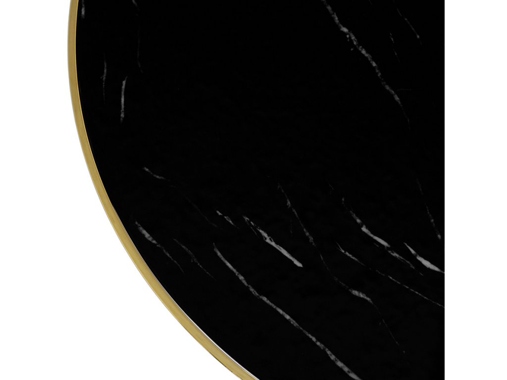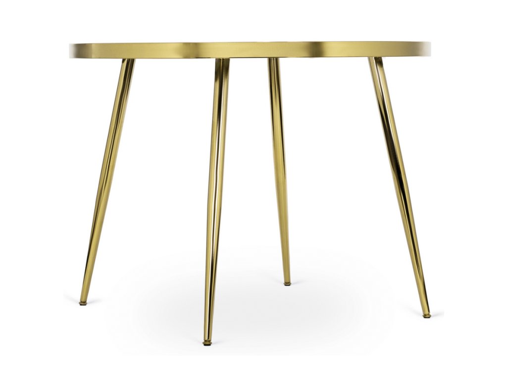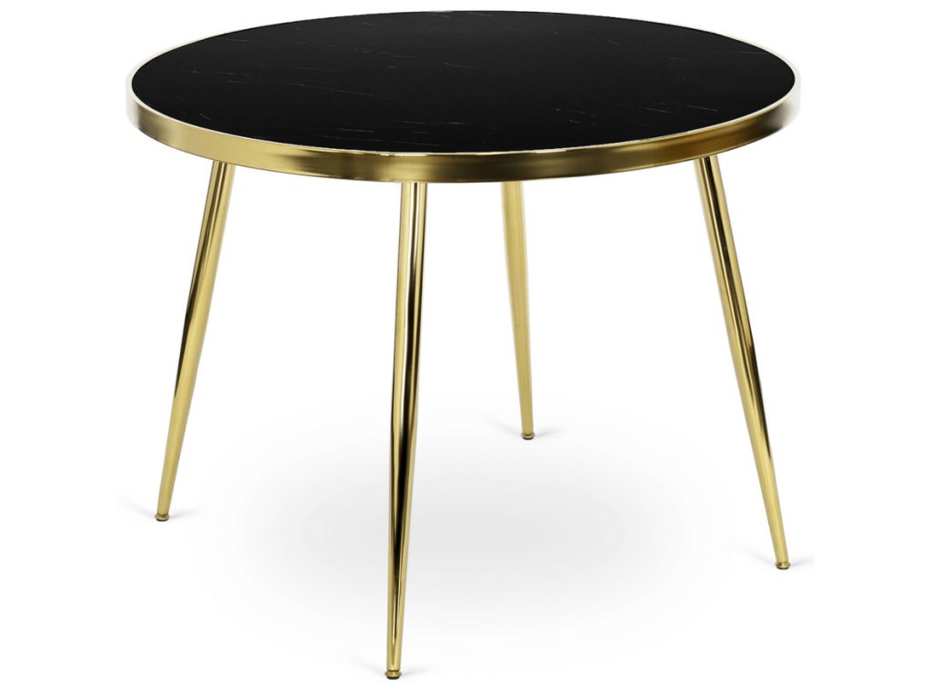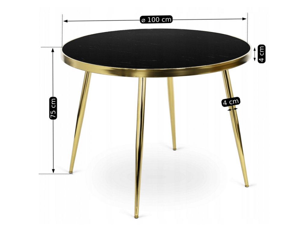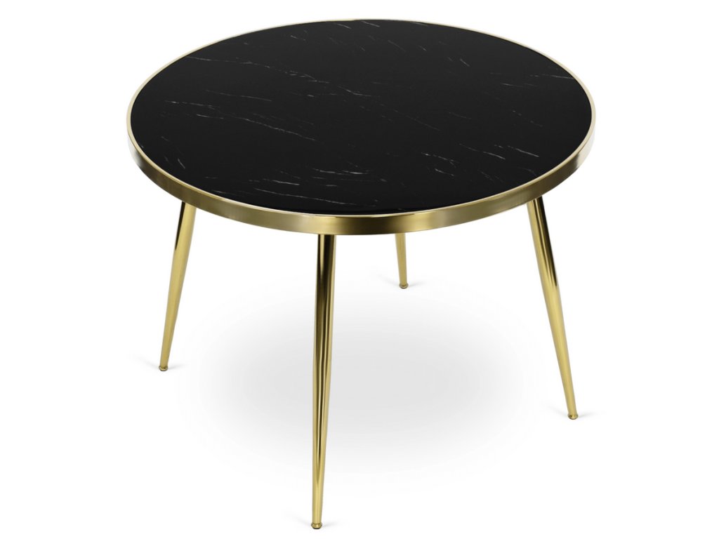 Okrúhly jedálenský stôl AMADORA s priemerom 100 cm má pevnú dosku s povrchom v dekore čierneho mramoru, ktorá pôsobí elegantne a moderne. Zlatá kovová podnož dodáva stolu štýlový a exkluzívny vzhľad, typický pre glamour interiéry.