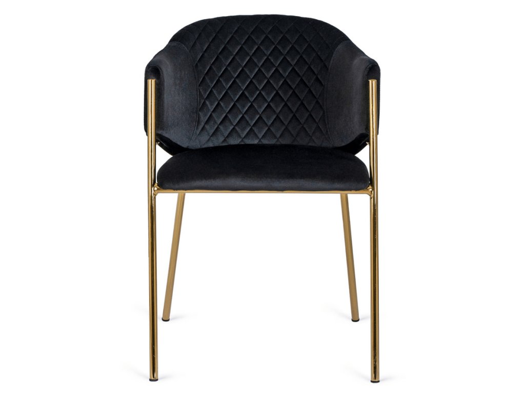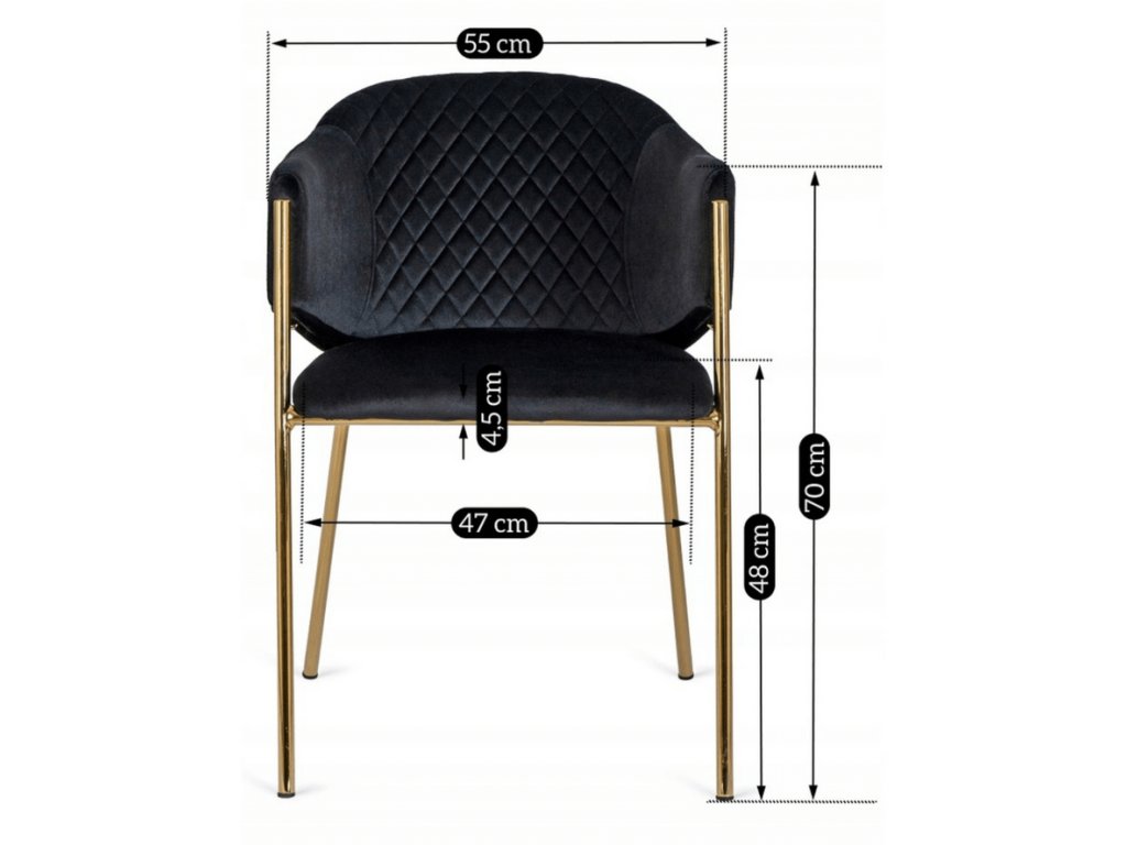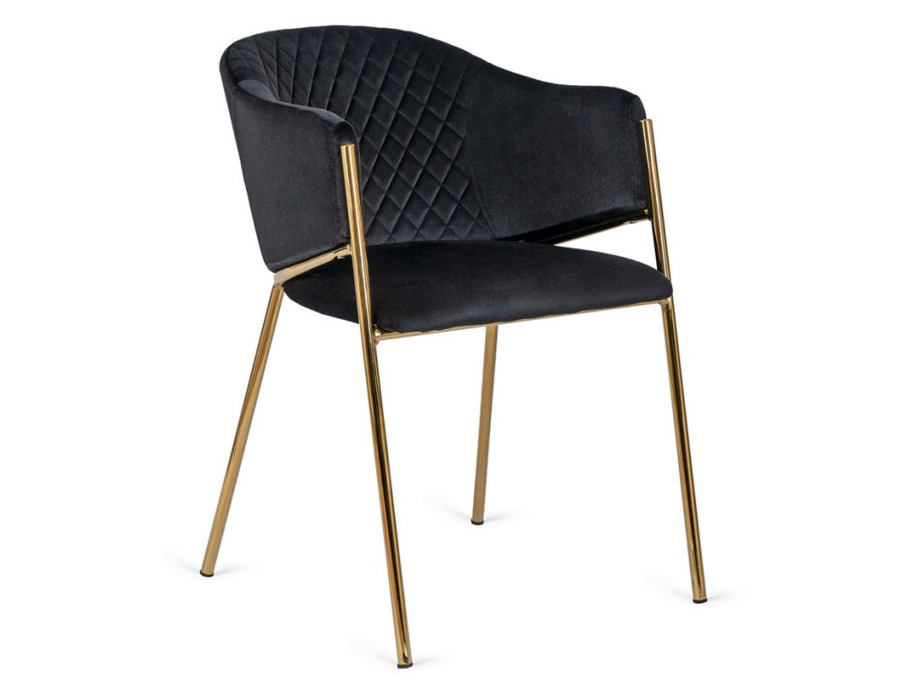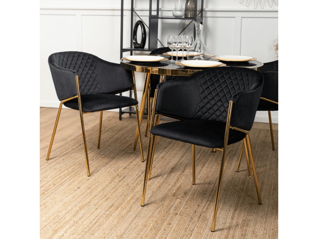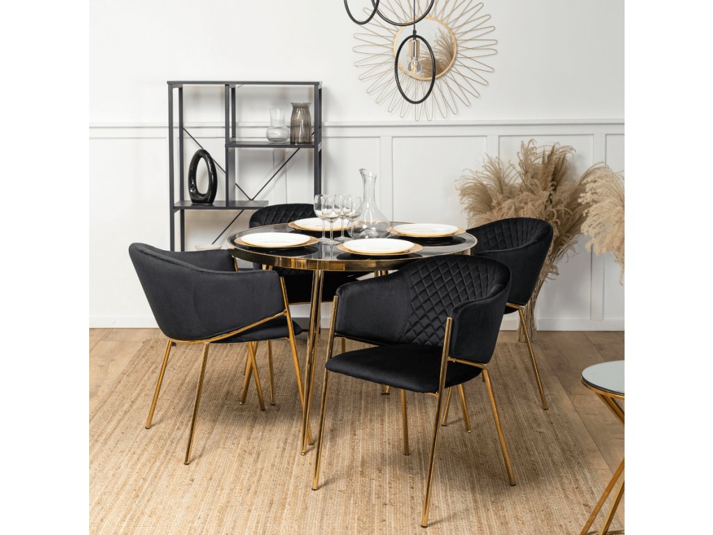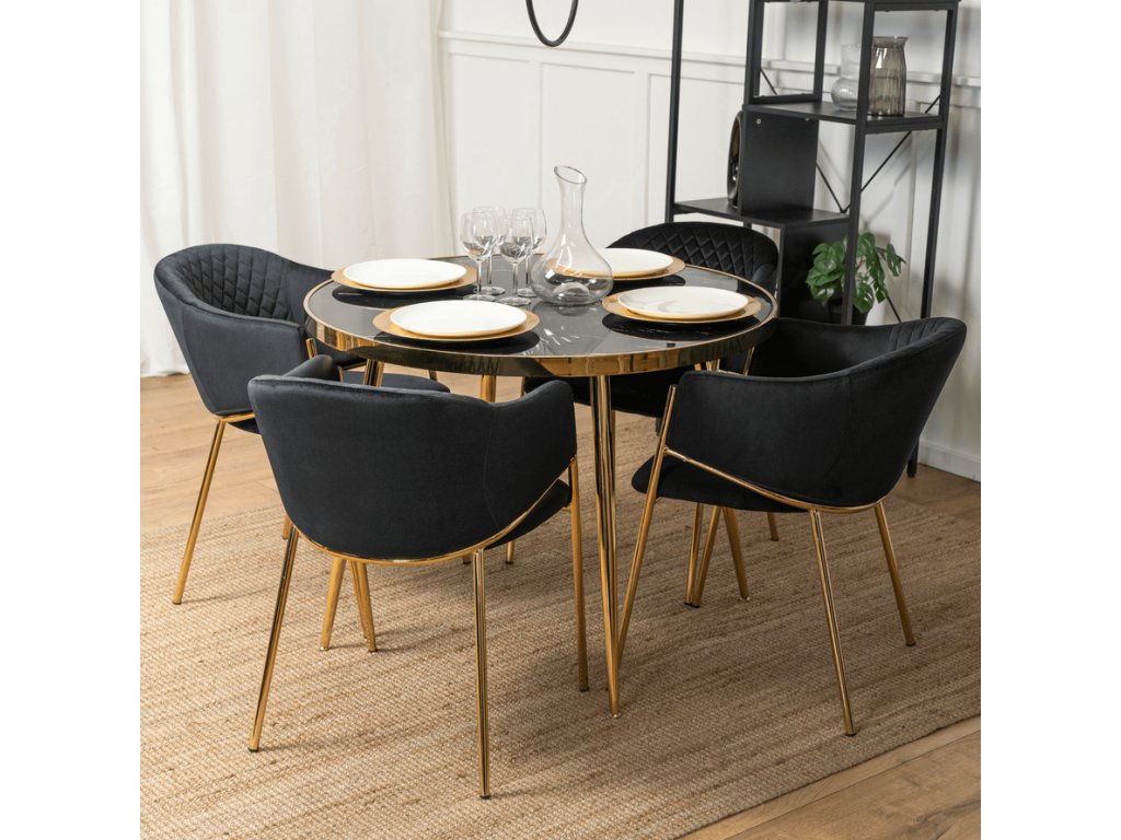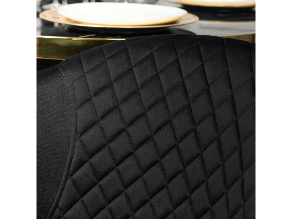 Súčasťou zostavy sú 4 čalúnené stoličky CLARA v čiernej farbe. Mäkké zamatové čalúnenie, elegantné prešívanie a zlaté nohy vytvárajú harmonický a luxusný celok. Stoličky sú nielen krásne, ale aj pohodlné – ideálne na dlhé večere či rodinné posedenia.
