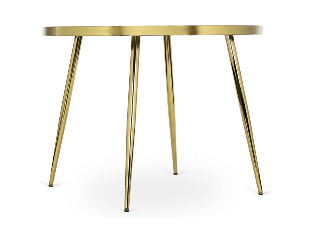 Okrúhly jedálenský stôl AMADORA s priemerom 100 cm má pevnú dosku s povrchom v dekore bieleho mramoru, ktorá pôsobí elegantne a moderne. Zlatá kovová podnož dodáva stolu štýlový a exkluzívny vzhľad, typický pre glamour interiéry.