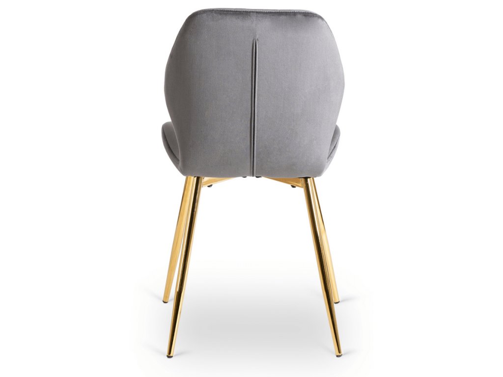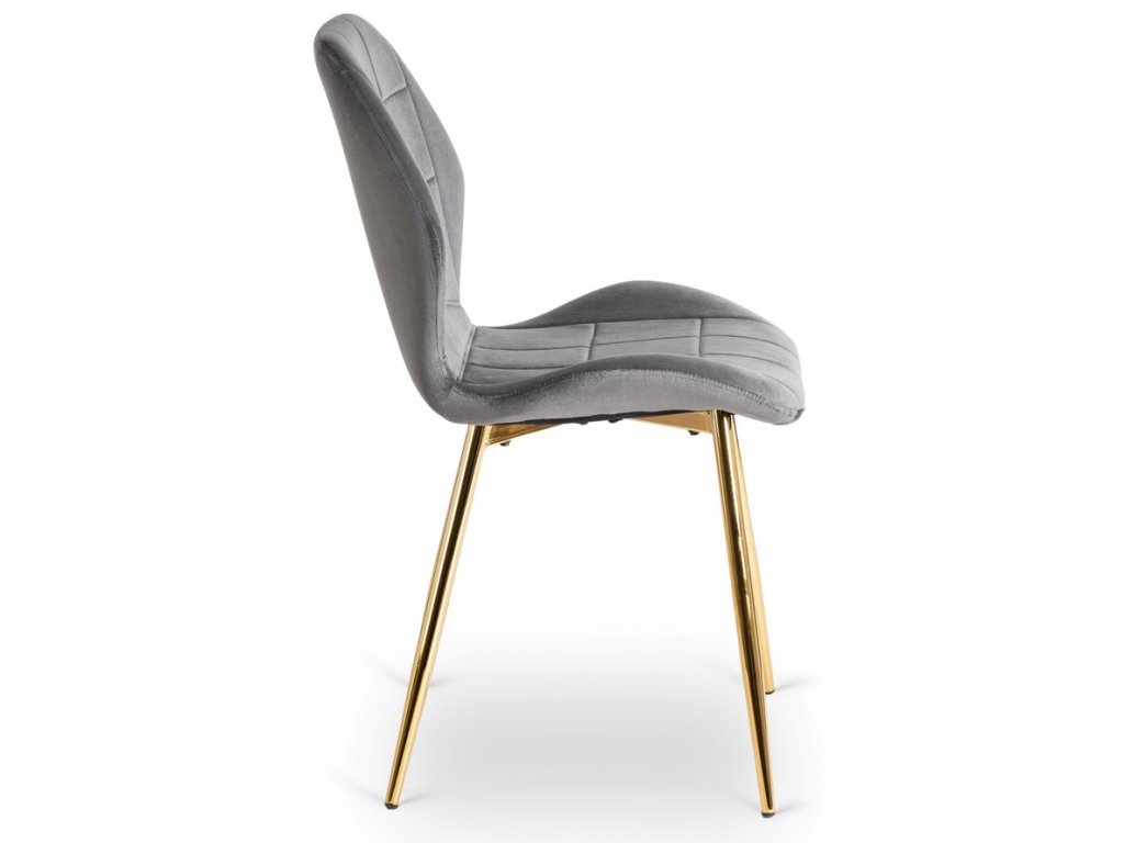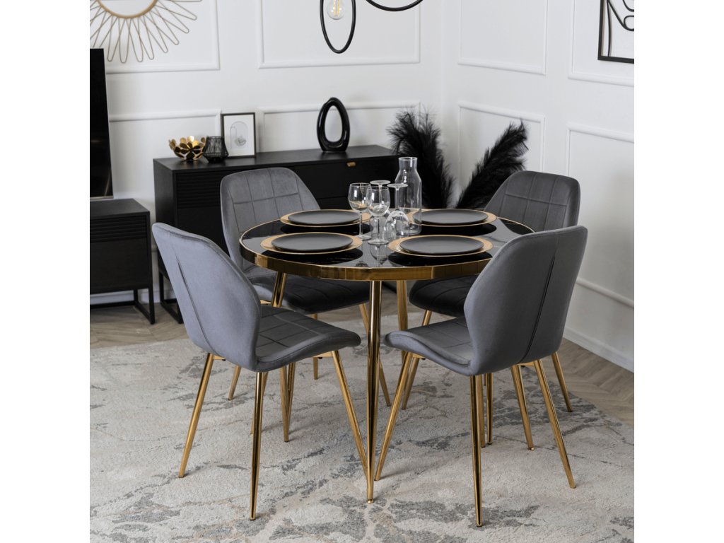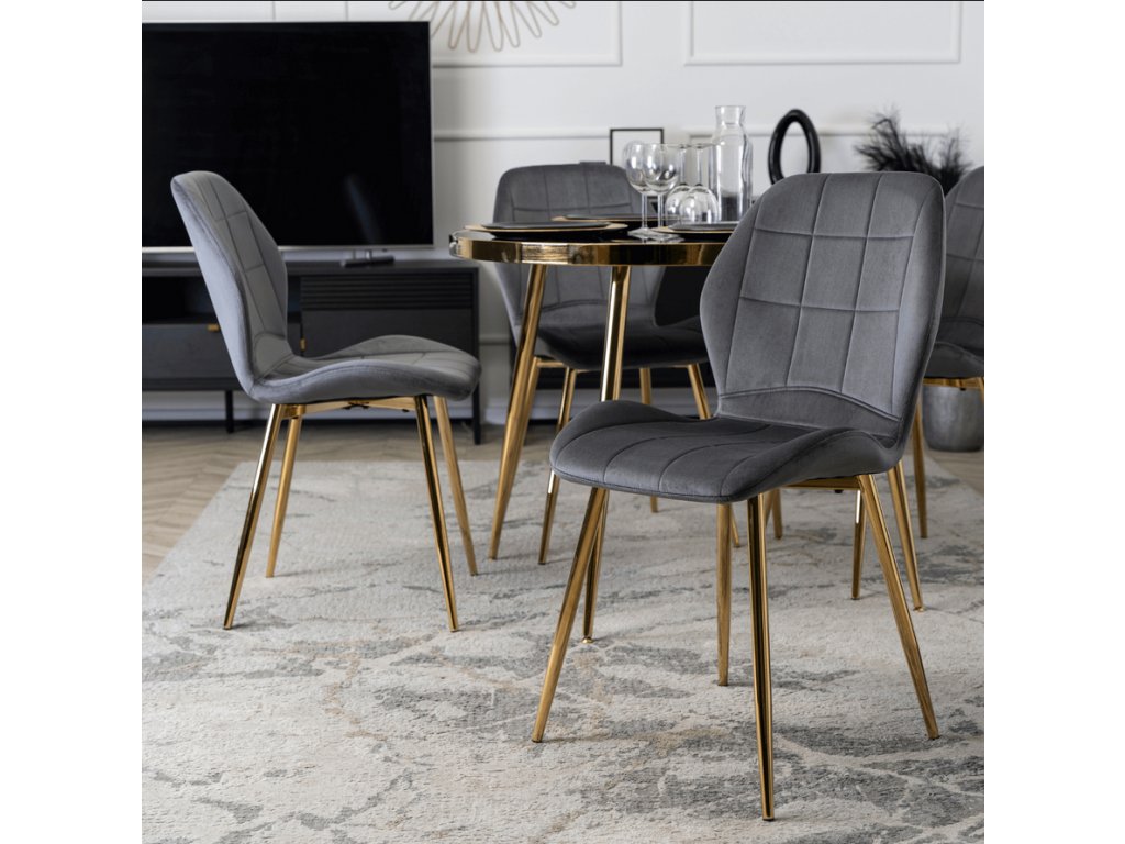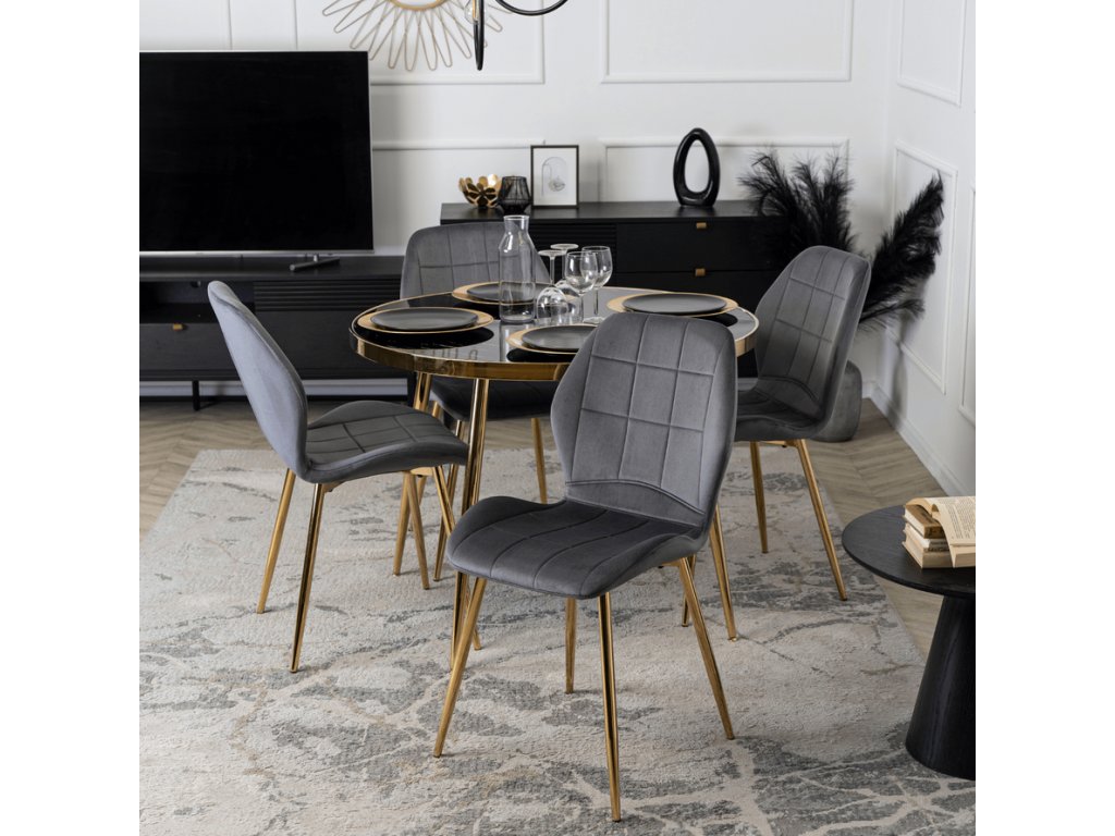 Súčasťou zostavy sú 4 čalúnené stoličky IBIS v sivej farbe. Mäkké zamatové čalúnenie, elegantné prešívanie a zlaté nohy vytvárajú harmonický a luxusný celok. Stoličky sú nielen krásne, ale aj pohodlné – ideálne na dlhé večere či rodinné posedenia.