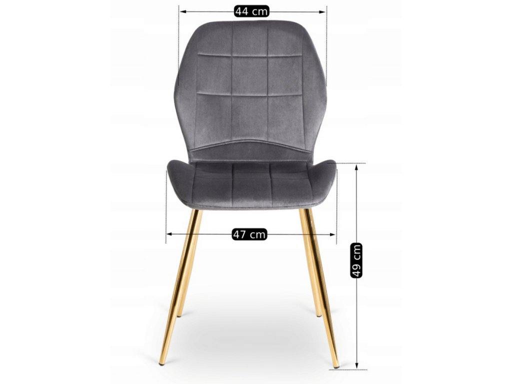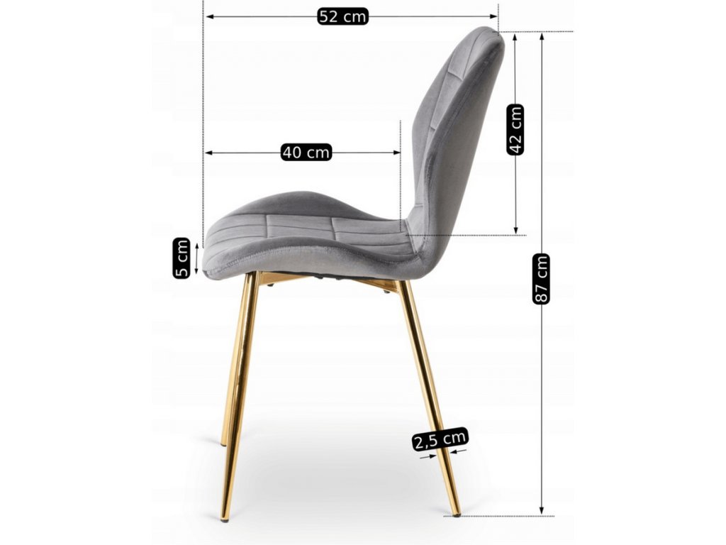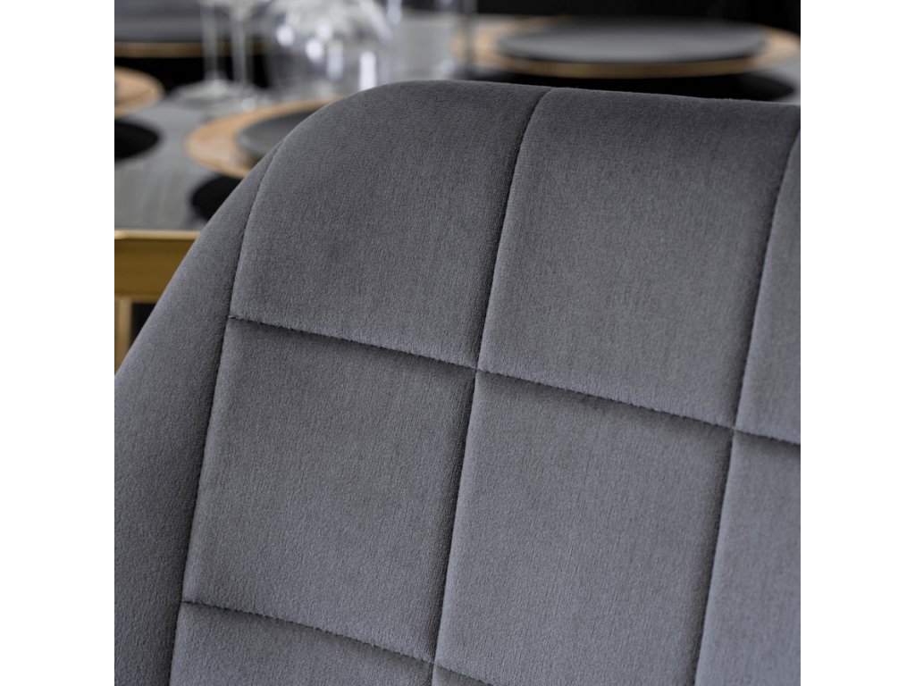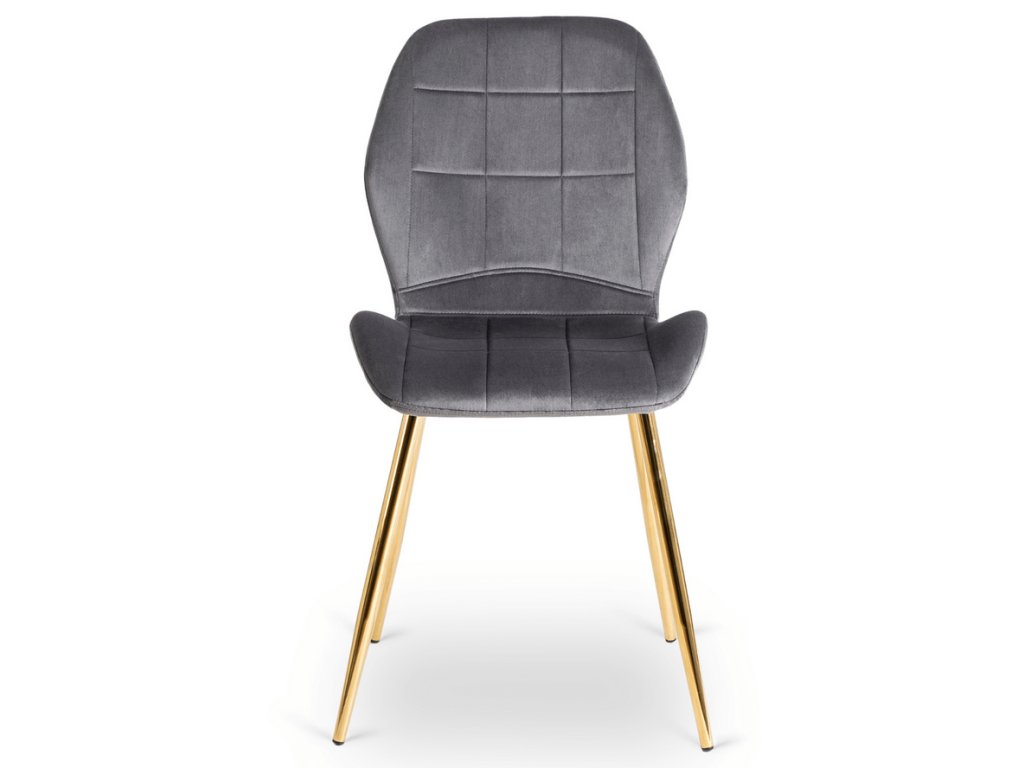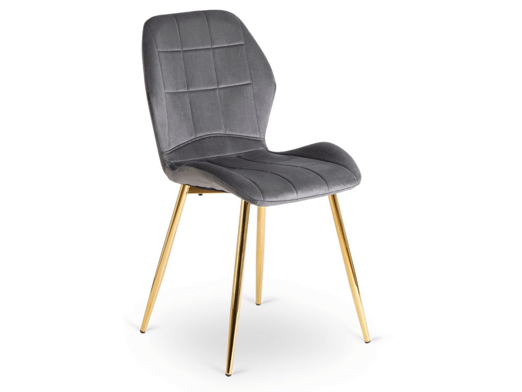 Súčasťou zostavy sú 4 čalúnené stoličky IBIS v sivej farbe. Mäkké zamatové čalúnenie, elegantné prešívanie a zlaté nohy vytvárajú harmonický a luxusný celok. Stoličky sú nielen krásne, ale aj pohodlné – ideálne na dlhé večere či rodinné posedenia.