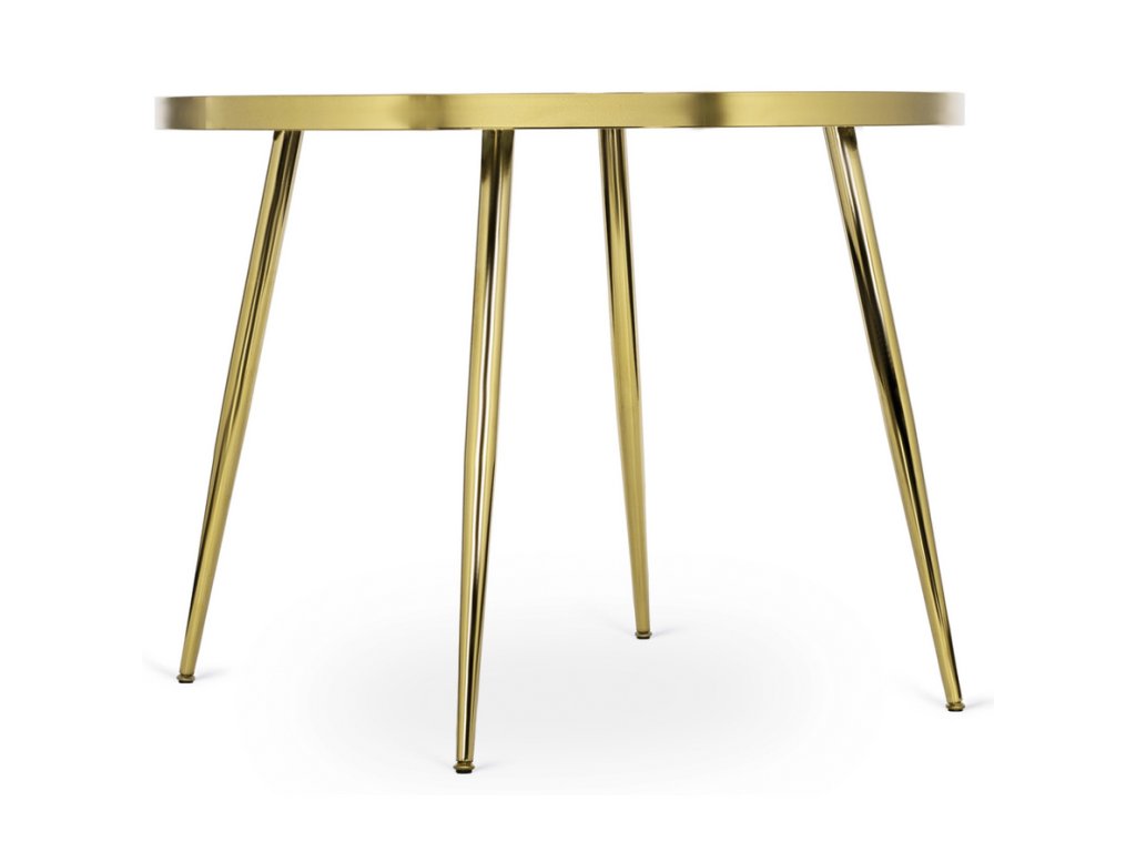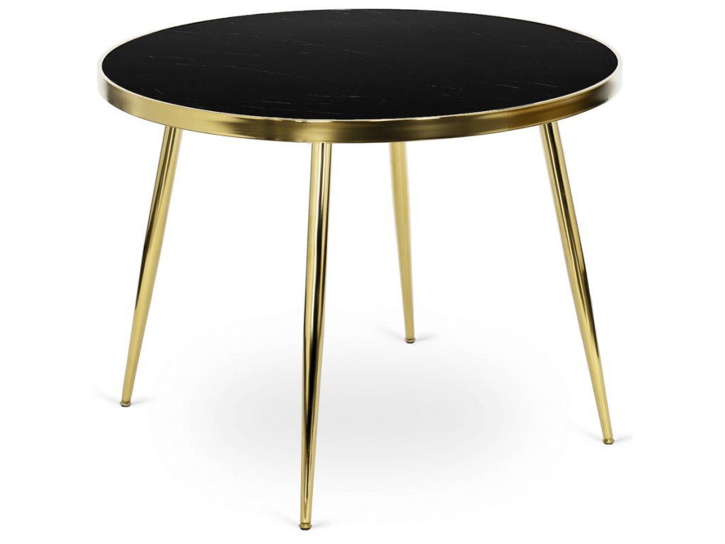 Okrúhly jedálenský stôl AMADORA s priemerom 100 cm má pevnú dosku s povrchom v dekore čierneho mramoru, ktorá pôsobí elegantne a moderne. Zlatá kovová podnož dodáva stolu štýlový a exkluzívny vzhľad, typický pre glamour interiéry.