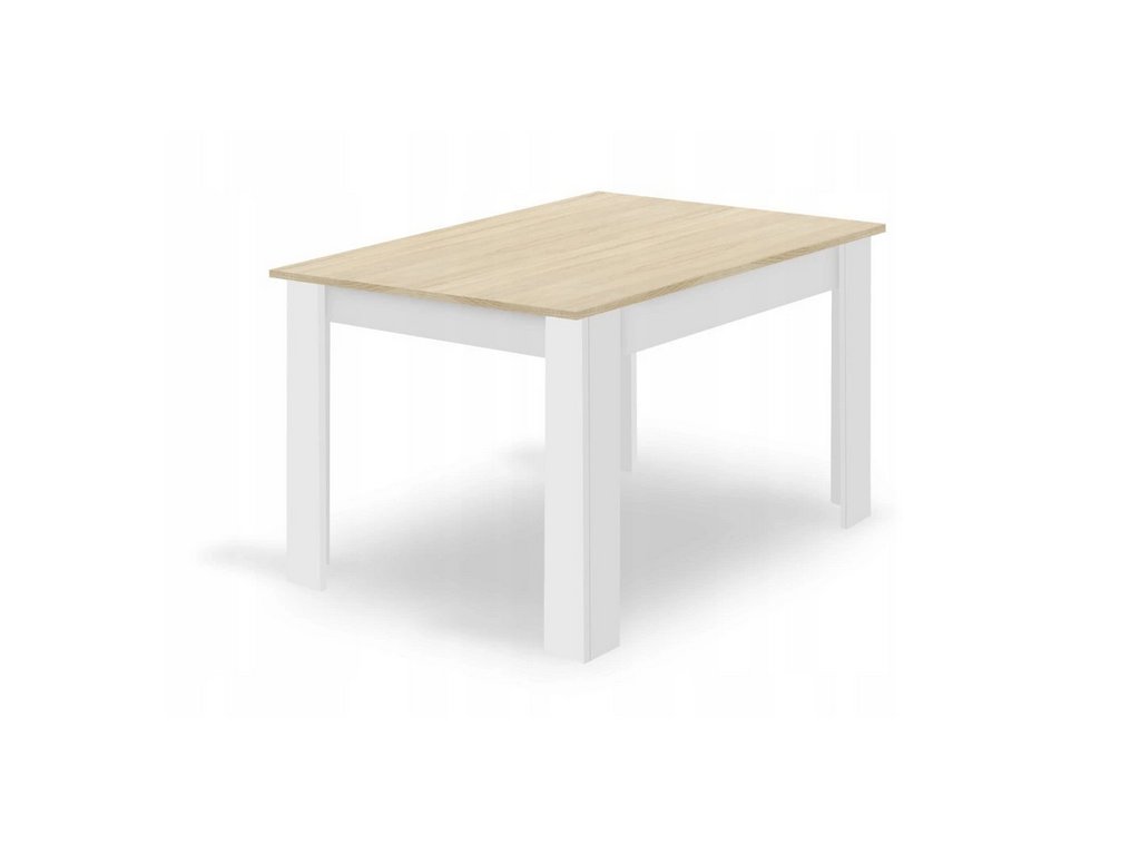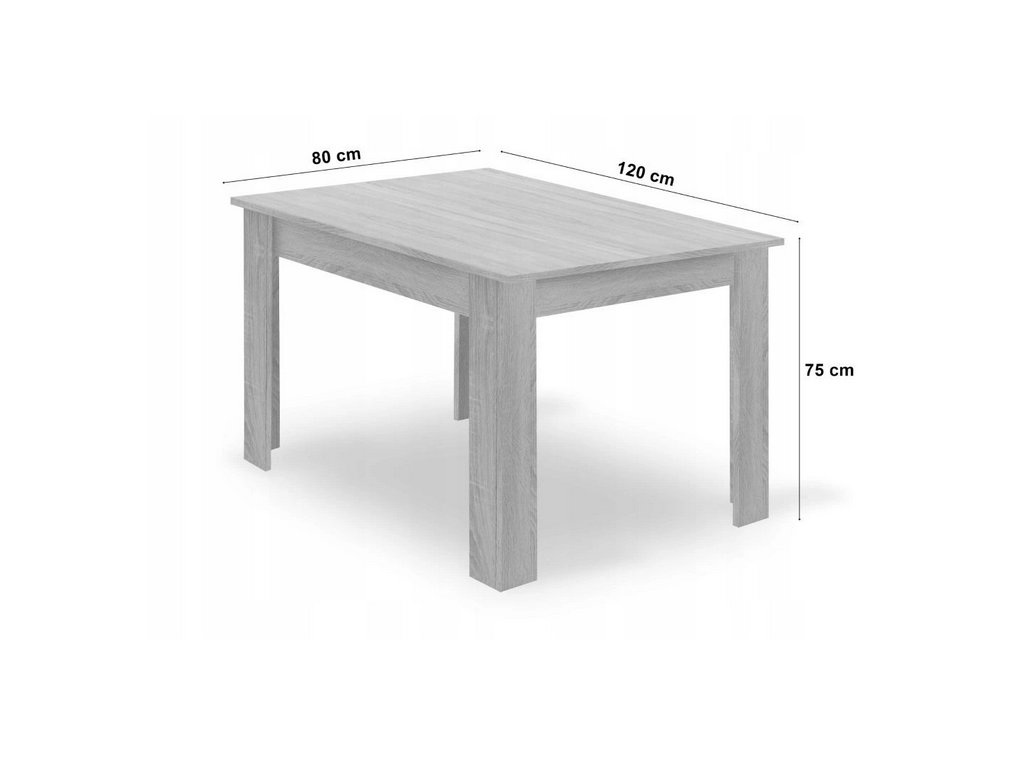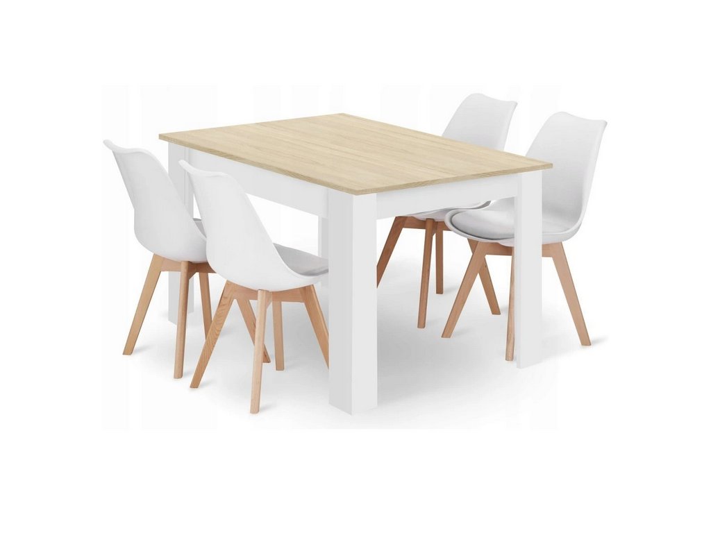 Jedálenský stôl v dekore dub sonoma s bielymi nohami má rozmery 120 × 80 cm, čím ponúka dostatok priestoru pre rodinné stolovanie aj príjemné posedenia s priateľmi. Kontrast medzi svetlým drevom a bielou farbou stoličiek vytvára jemný a moderný vzhľad, ktorý ľahko zapadne do rôznych štýlov interiéru – od moderného až po minimalistický.
