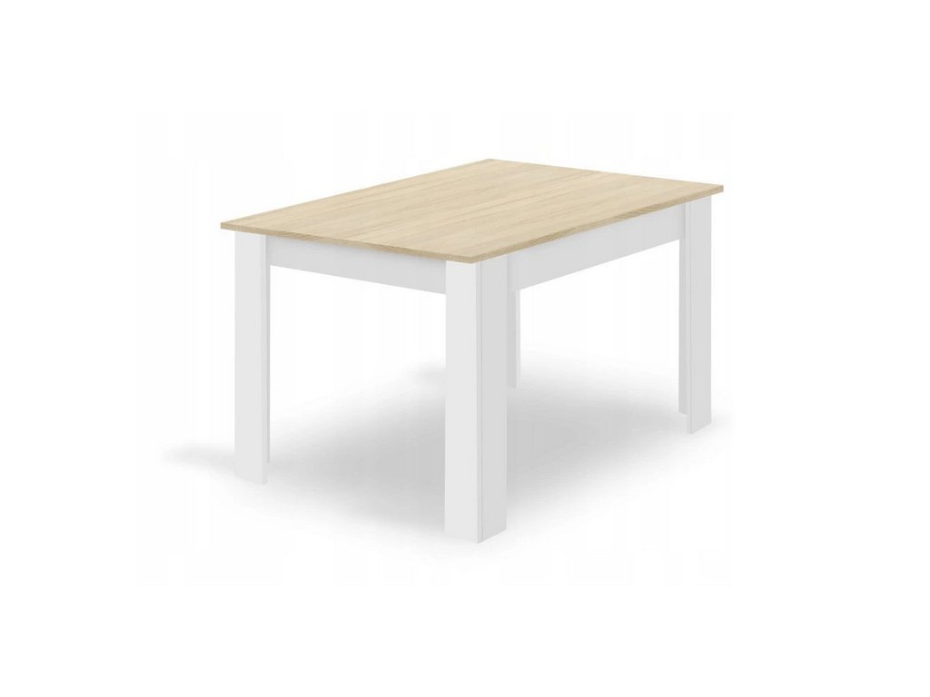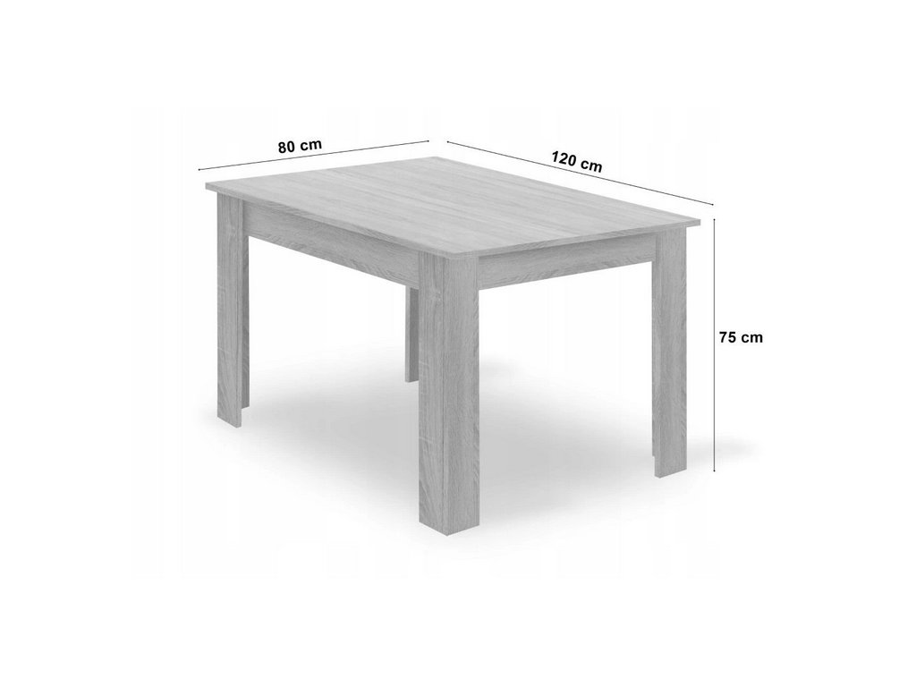Jedálenský stôl v dekore dub sonoma s bielymi nohami má rozmery 120 × 80 cm, čím ponúka dostatok priestoru pre rodinné stolovanie aj príjemné posedenia s priateľmi. Kontrast medzi svetlým drevom a čiernou farbou stoličiek vytvára jemný a moderný vzhľad, ktorý ľahko zapadne do rôznych štýlov interiéru – od moderného až po minimalistický.