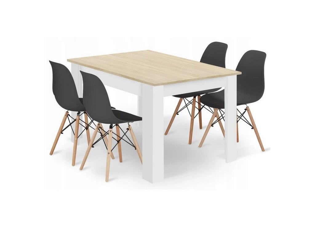 Táto elegantná jedálenská súprava v kombinácii stola v dekore dub sonoma s bielymi nohami a 4 čiernych stoličiek MARK prinesie do vašej kuchyne alebo jedálne sviežosť, svetlo a moderný štýl.