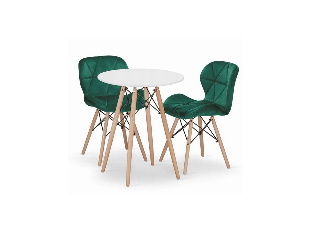 Jedálenský set TODI + 2 stoličky LAGO je ideálnym riešením pre menšie priestory. Okrúhly stôl s bielou doskou a bukovými nohami dopĺňajú pohodlné zelené stoličky so zamatovým poťahom. Kombinácia moderného a škandinávskeho štýlu vytvára elegantný a funkčný doplnok do kuchyne či jedálne.