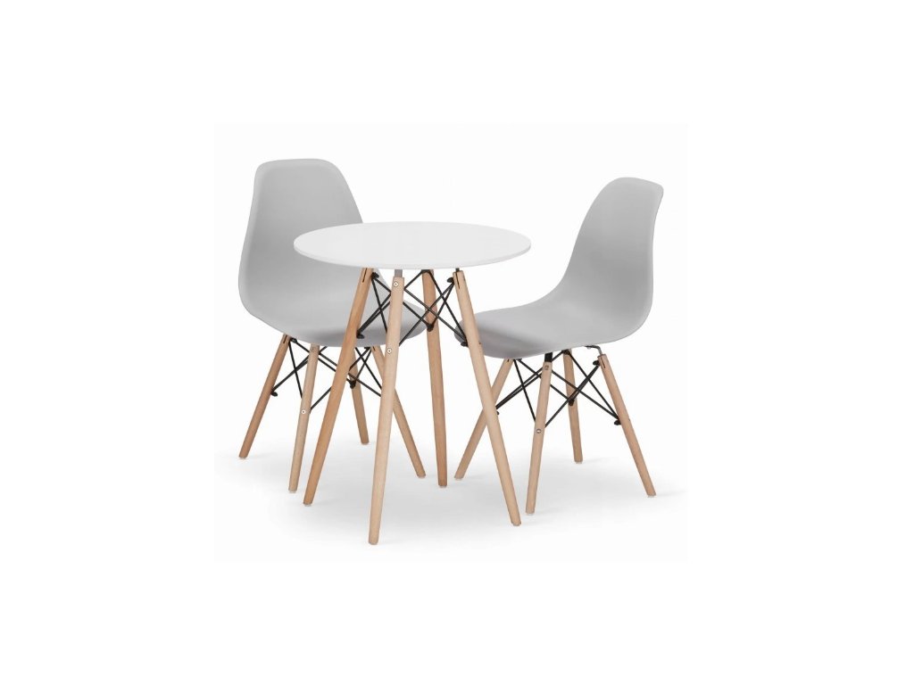 Jedálenský set TODI 60 cm + 2 stoličky OSAKA – sivé je štýlový set v škandinávskom dizajne. Je ideálny do menších kuchýň a jedální. Stôl s bielou doskou a bukovými nohami dopĺňajú dve sivé stoličky s pohodlným sedákom, ktoré spolu vytvárajú moderný a nadčasový celok.