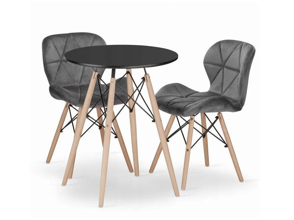 Okrúhly stôl TODI s priemerom 60 cm má čiernu dosku a stabilné nohy z prírodného bukového dreva, ktoré dodávajú interiéru útulný charakter. Dve stoličky LAGO so sivým zamatovým čalúnením a mäkkým sedákom poskytujú vysoký komfort pri sedení a dopĺňajú celkový elegantný vzhľad setu.