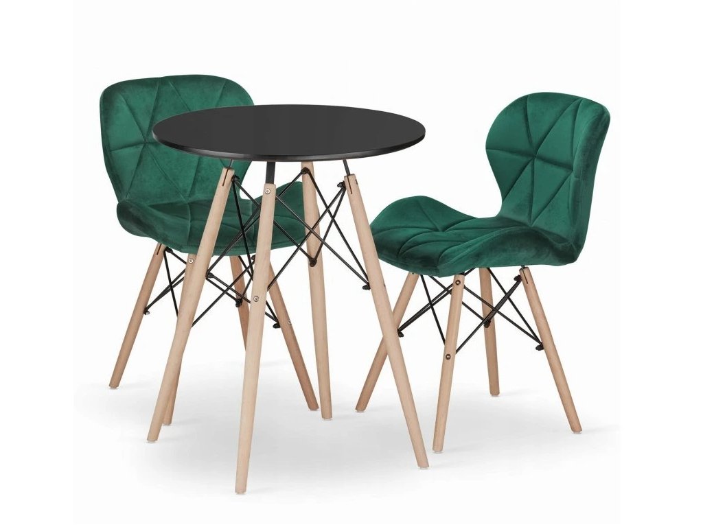 Jedálenský set TODI 60 cm + 2 stoličky LAGO – zelené je moderný set v škandinávskom štýle je ideálny do menších jedální a kuchýň. Okrúhly stôl s čiernou doskou a bukovými nohami dopĺňajú dve zelené zamatové stoličky s mäkkým sedákom, ktoré spolu vytvárajú elegantný a pohodlný priestor na každodenné stolovanie.