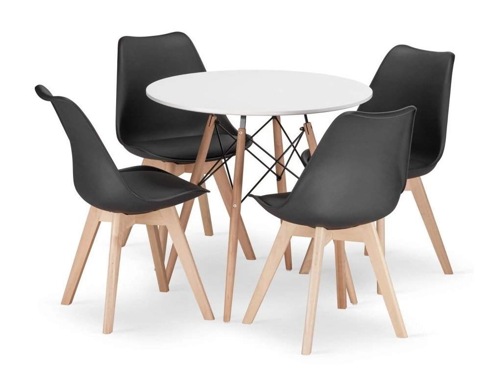 Jedálenský set TODI 80 cm + 4 stoličky MARK – čierne je štýlový jedálenský set v škandinávskom duchu spája eleganciu a praktickosť. Okrúhly stôl s bielou doskou a bukovými nohami dopĺňajú štyri čierne stoličky s mäkkým sedákom, ktoré zabezpečia komfort a harmonický vzhľad do každej kuchyne či jedálne.