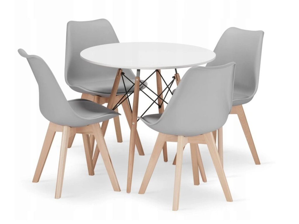 Jedálenský set TODI 80 cm + 4 stoličky MARK – sivé je štýlový jedálenský set v škandinávskom duchu spája eleganciu a praktickosť. Okrúhly stôl s bielou doskou a bukovými nohami dopĺňajú štyri sivé stoličky s mäkkým sedákom, ktoré zabezpečia komfort a harmonický vzhľad do každej kuchyne či jedálne.
