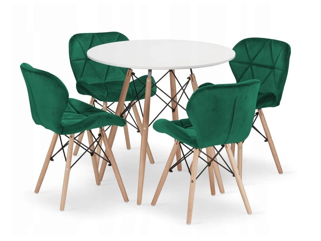 Jedálenský set TODI 80 cm + 4 stoličky LAGO – zelené je moderný jedálenský set v škandinávskom štýle je ideálny do menších jedální a kuchýň. Stôl s bielou doskou a bukovými nohami dopĺňajú štyri pohodlné sivé zamatové stoličky, ktoré vytvárajú elegantný a praktický priestor na každodenné stolovanie.