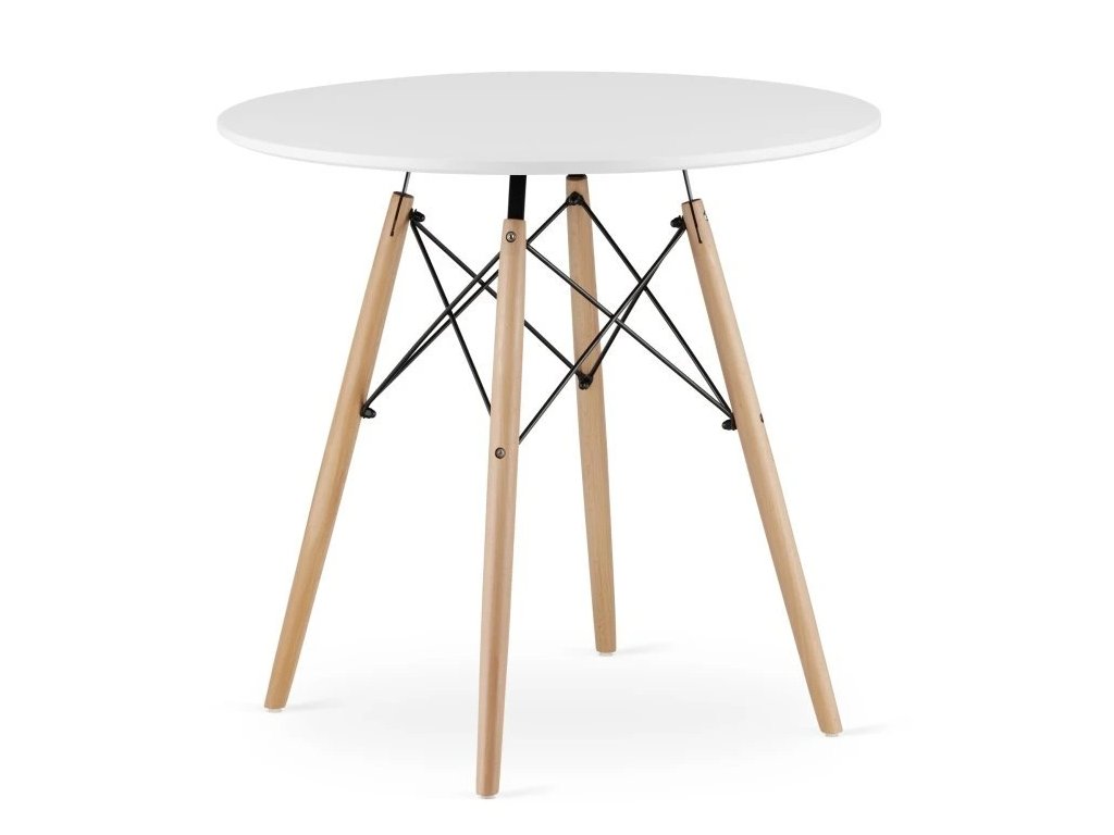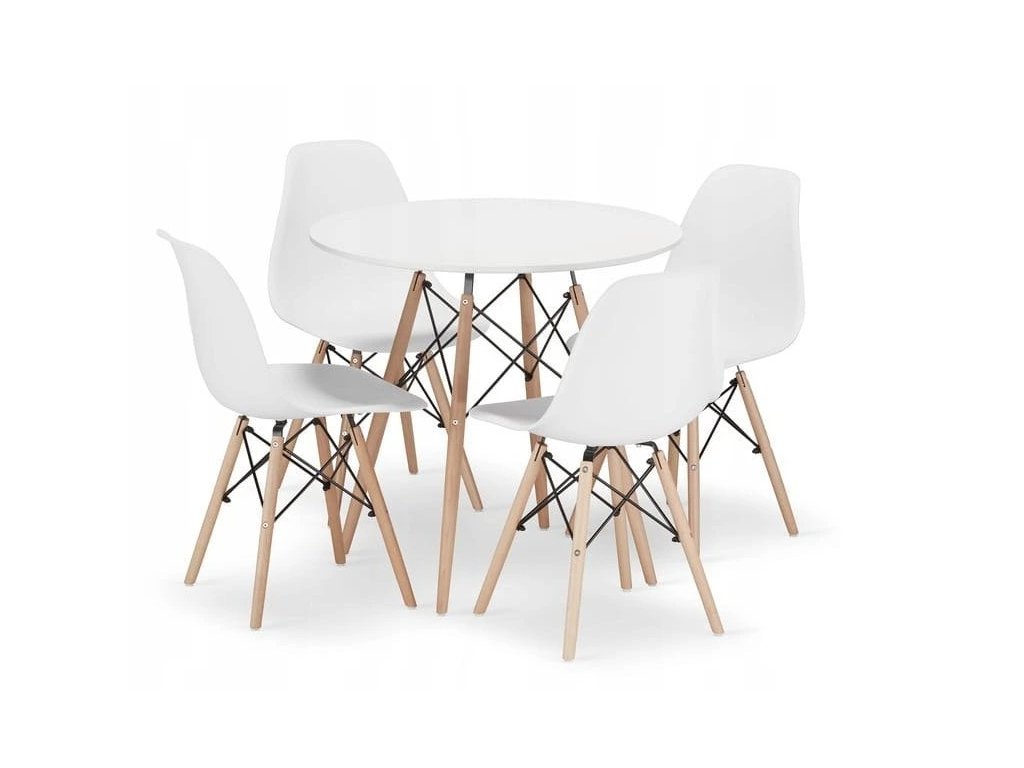 Jedálenský set TODI 80 cm + 4 stoličky OSAKA – biele je moderný škandinávsky set s bielym stolom a bukovými nohami je ideálny do menších jedální a kuchýň. Štyri pohodlné stoličky vytvárajú elegantný a praktický priestor na každodenné stolovanie.