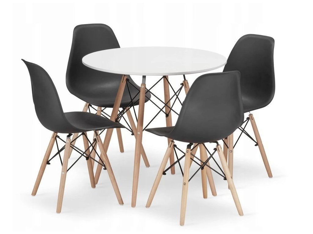 Jedálenský set TODI 80 cm + 4 stoličky OSAKA –čierne je moderný škandinávsky set s bielym stolom a bukovými nohami je ideálny do menších jedální a kuchýň. Štyri pohodlné stoličky vytvárajú elegantný a praktický priestor na každodenné stolovanie.