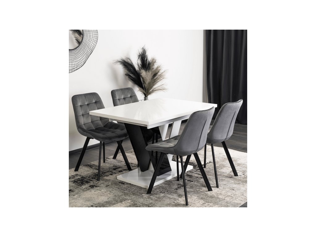 Masívna stolová doska v dekore biely/čierny lesk pôsobí nadčasovo a elegantne, zatiaľ čo pevné čierne nohy v modernom priemyselnom štýle zaisťujú stabilitu a dlhú životnosť. Vďaka svojmu dizajnu sa stôl skvele hodí k rôznym typom stoličiek a ľahko zapadne do moderného, industriálneho či glamour štýlu.
