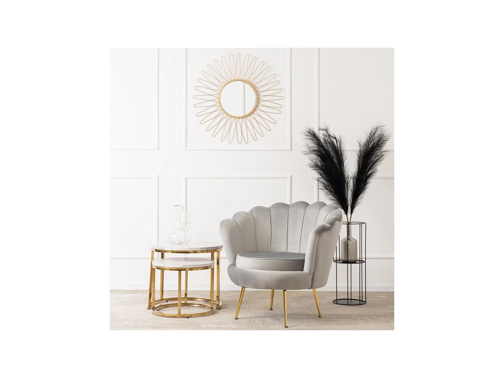 Kreslo VELO v sivej zamatovej látke s elegantnou zlatou kovovou konštrukciou je dokonalým doplnkom do moderného interiéru. Kombinuje luxusný vzhľad so skutočným pohodlím – vďaka mäkkému sedáku, ergonomickému tvaru a kvalitným materiálom. Vynikne v obývačke, spálni, pracovni aj štýlovom kútiku na oddych.