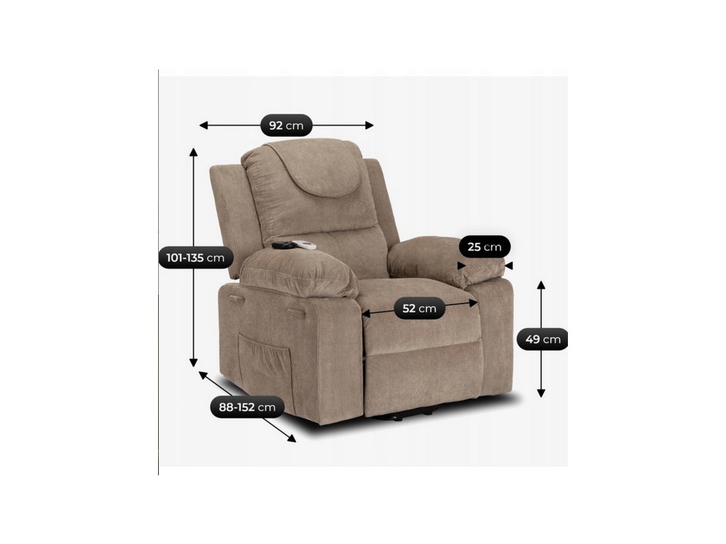 Masážne kreslo MARCOS v elegantnej bežovej farbe ponúka maximálny komfort a praktickosť. Disponuje funkciou masáže aj asistovaného vstávania, ktorá uľahčuje postavenie sa z kresla. Mäkké čalúnenie a moderný dizajn zaručujú pohodlie aj štýl v každej domácnosti – ideálne pre oddych a relax.