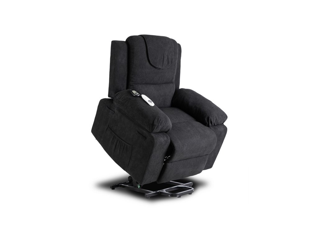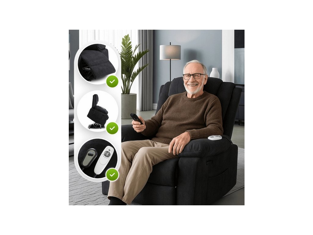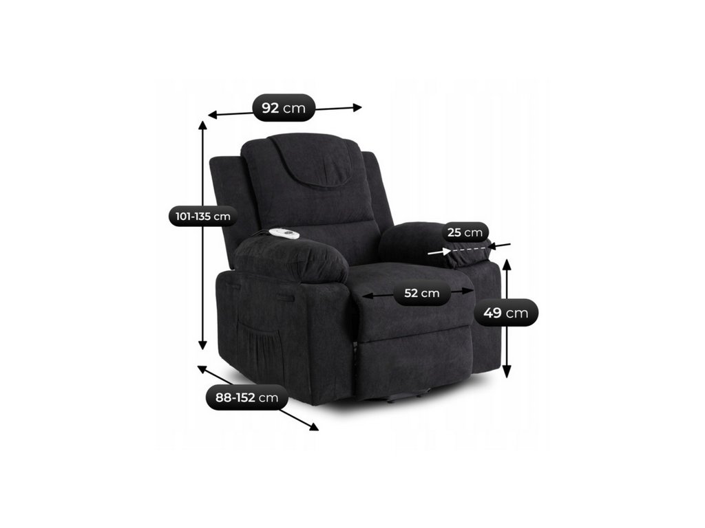 Masážne kreslo MARCOS v elegantnej čiernej farbe ponúka maximálny komfort a praktickosť. Disponuje funkciou masáže aj asistovaného vstávania, ktorá uľahčuje postavenie sa z kresla. Mäkké čalúnenie a moderný dizajn zaručujú pohodlie aj štýl v každej domácnosti – ideálne pre oddych a relax.