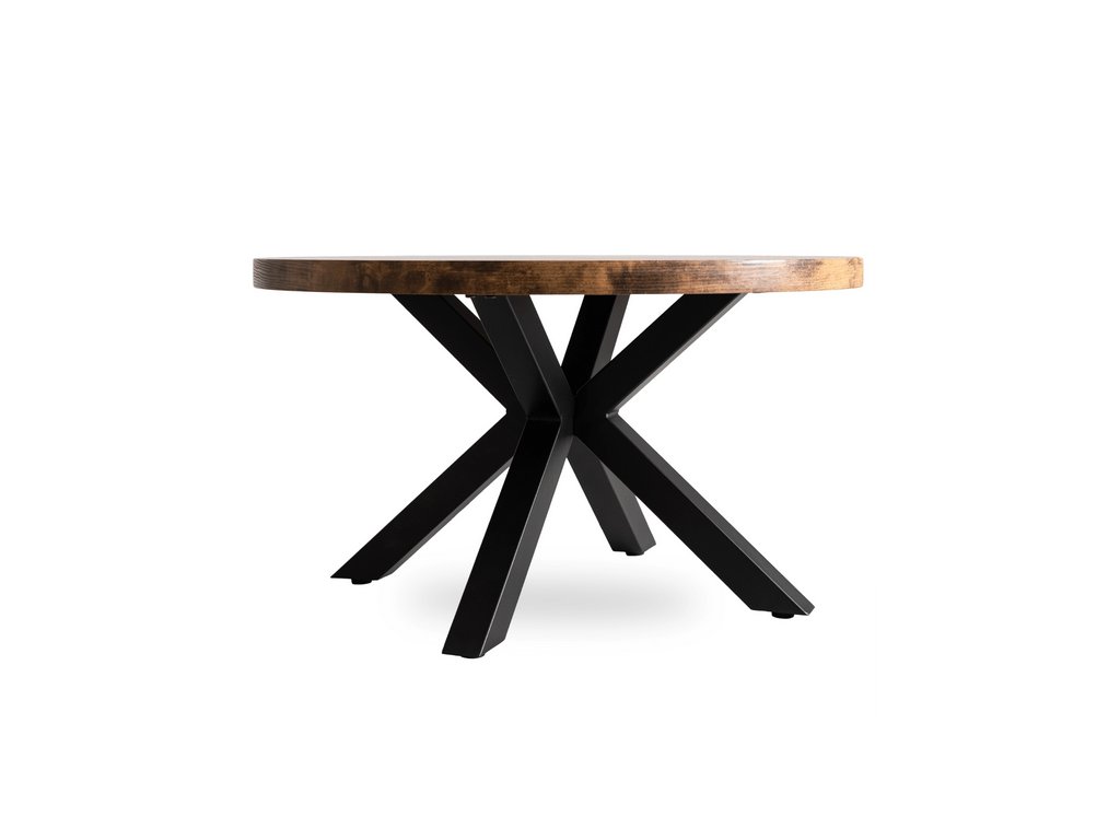 Stolík stojí na výraznej kovovej podnoži v tvare kríža, ktorá mu dodáva stabilitu a originálny charakter. Kombinácia kvalitnej povrchovej úpravy a robustnej konštrukcie zaručuje dlhú životnosť aj pri každodennom používaní.