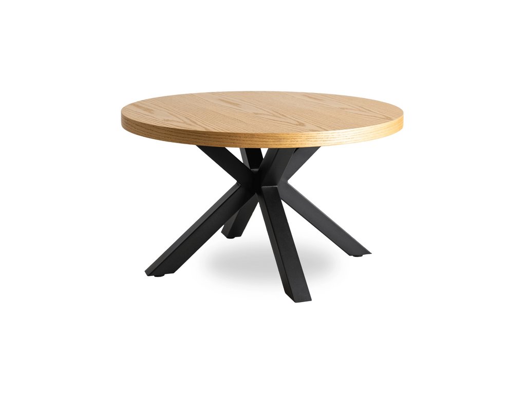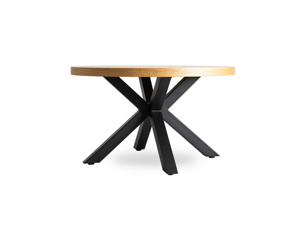 Stolík stojí na výraznej kovovej podnoži v tvare kríža, ktorá mu dodáva stabilitu a originálny charakter. Kombinácia kvalitnej povrchovej úpravy a robustnej konštrukcie zaručuje dlhú životnosť aj pri každodennom používaní.