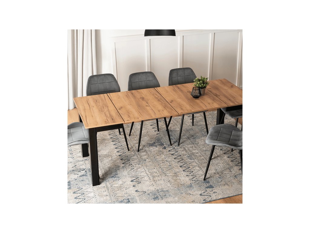 Rozkladací stôl DEMIAN kombinuje moderný dizajn s maximálnou funkčnosťou. V elegantnej kombinácii Dub Craft a čiernej pôsobí nadčasovo a harmonicky doplní každý interiér – od moderných po klasické jedálne.