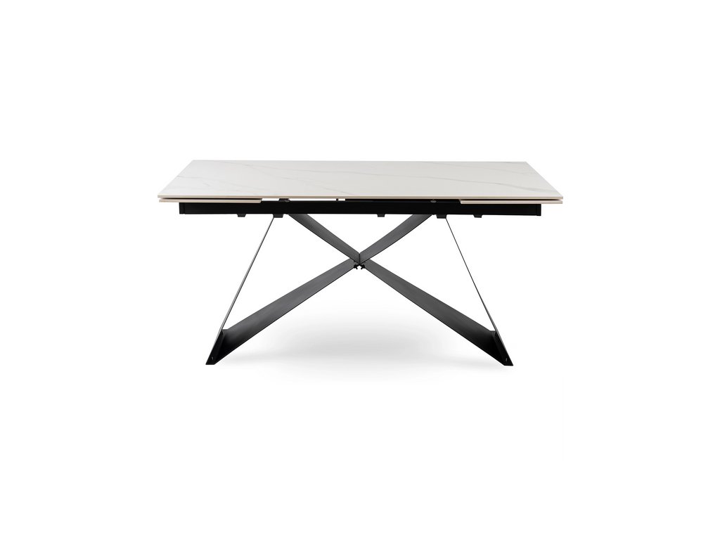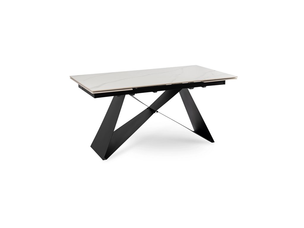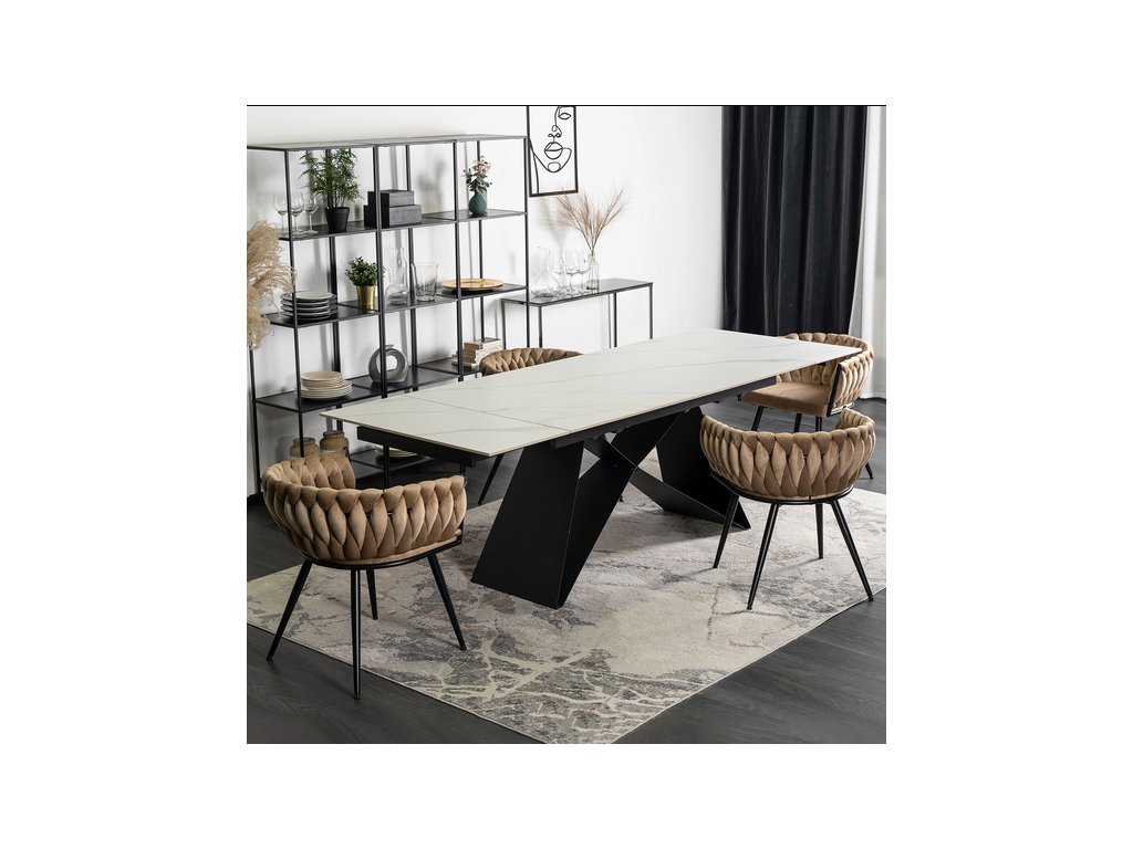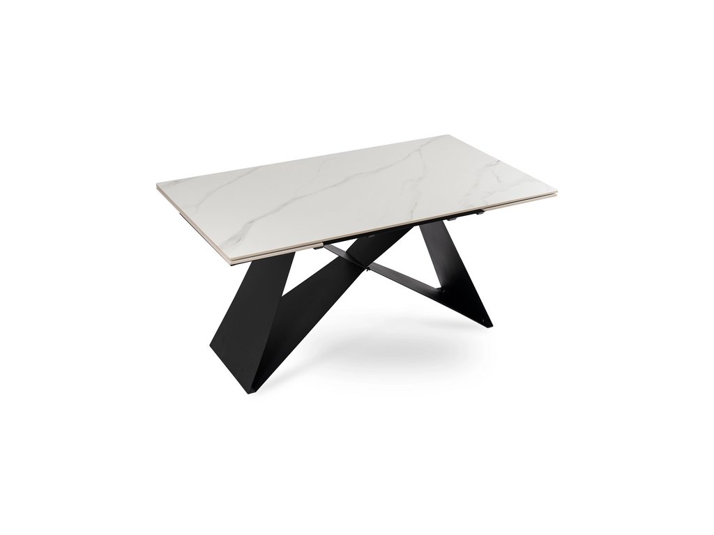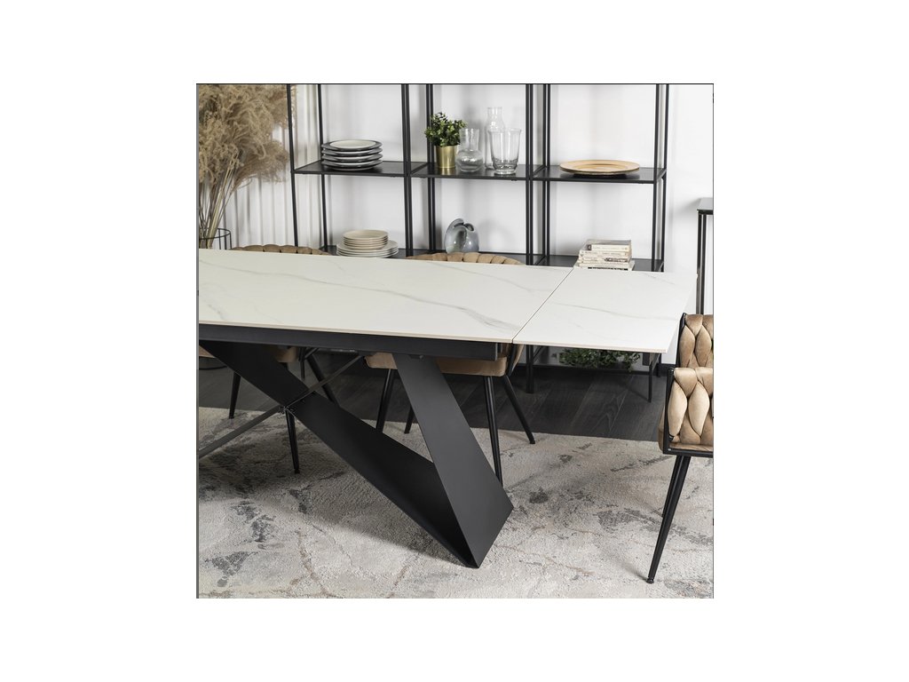 Rozkladací stôl ROCCO v modernom dekore bieleho mramoru s čiernou kovovou konštrukciou je ideálnym riešením pre tých, ktorí hľadajú spojenie luxusného vzhľadu a každodennej funkčnosti. Jeho minimalistický, no výrazný dizajn dokonale zapadne do moderných aj industriálnych interiérov.