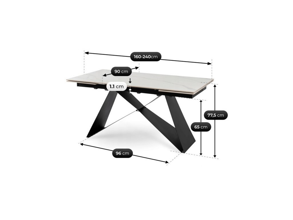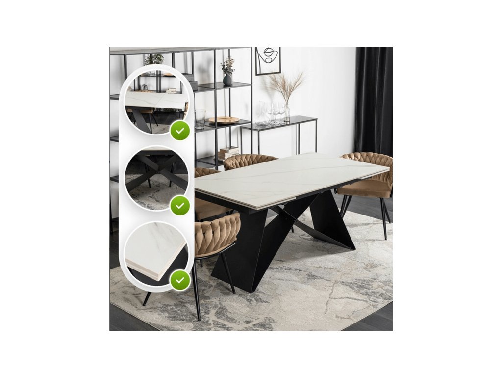 Rozkladací stôl ROCCO 160–240 cm v dekore bieleho mramoru s elegantnou čiernou kovovou podnožou je dokonalým spojením luxusu, funkčnosti a moderného dizajnu. Vďaka rozkladaciemu mechanizmu jednoducho predĺžite jeho dĺžku z 160 cm až na 240 cm, čo poskytuje dostatok miesta pre rodinu aj hostí. Keramická doska v imitácii bieleho mramoru je odolná voči poškriabaniu, vlhkosti a ľahko sa čistí. Stôl ROCCO je ideálnym doplnkom do modernej jedálne alebo kuchyne, kde sa spája elegancia s praktickosťou.