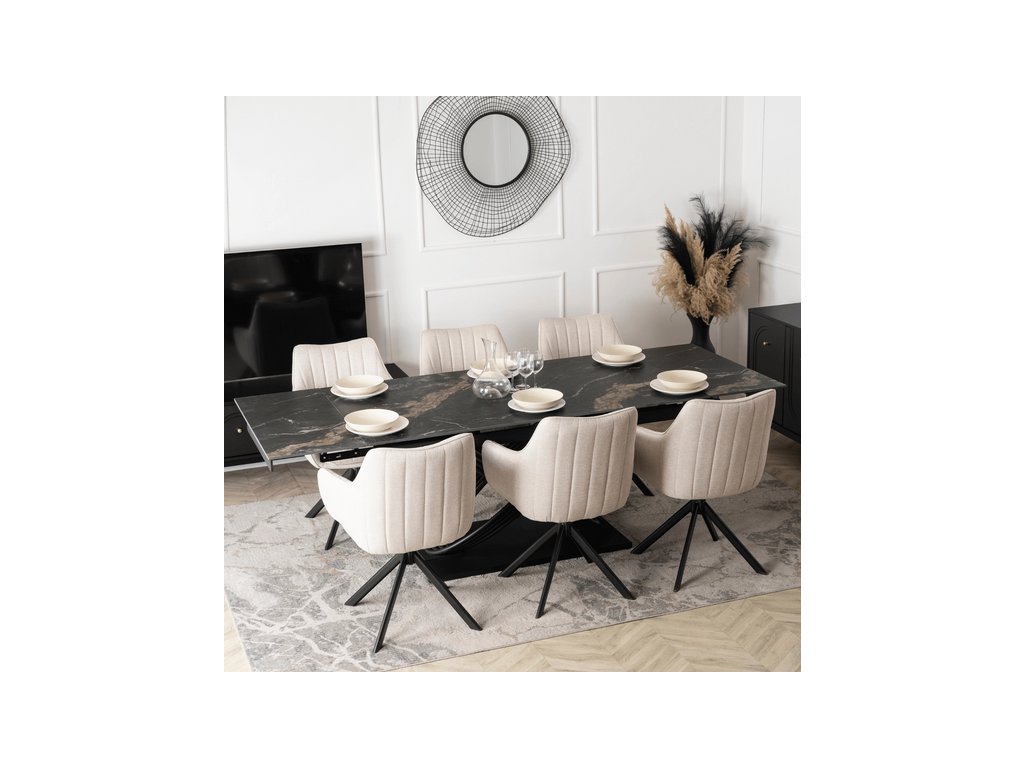 Rozkladací stôl RONNY 160–240 cm v luxusnom dekore čierneho mramoru so čiernym kovovým korpusom kombinuje elegantný dizajn s praktickosťou. Obdĺžnikový stôl je rozkladací, takže jeho dĺžku môžete jednoducho prispôsobiť podľa potreby – od 160 cm až po 240 cm. Stabilná kovová konštrukcia a keramická doska zaručujú odolnosť a jednoduchú údržbu. Stôl RONNY je ideálny pre rodinné stolovanie, stretnutia s priateľmi alebo štýlové doplnky moderných interiérov.