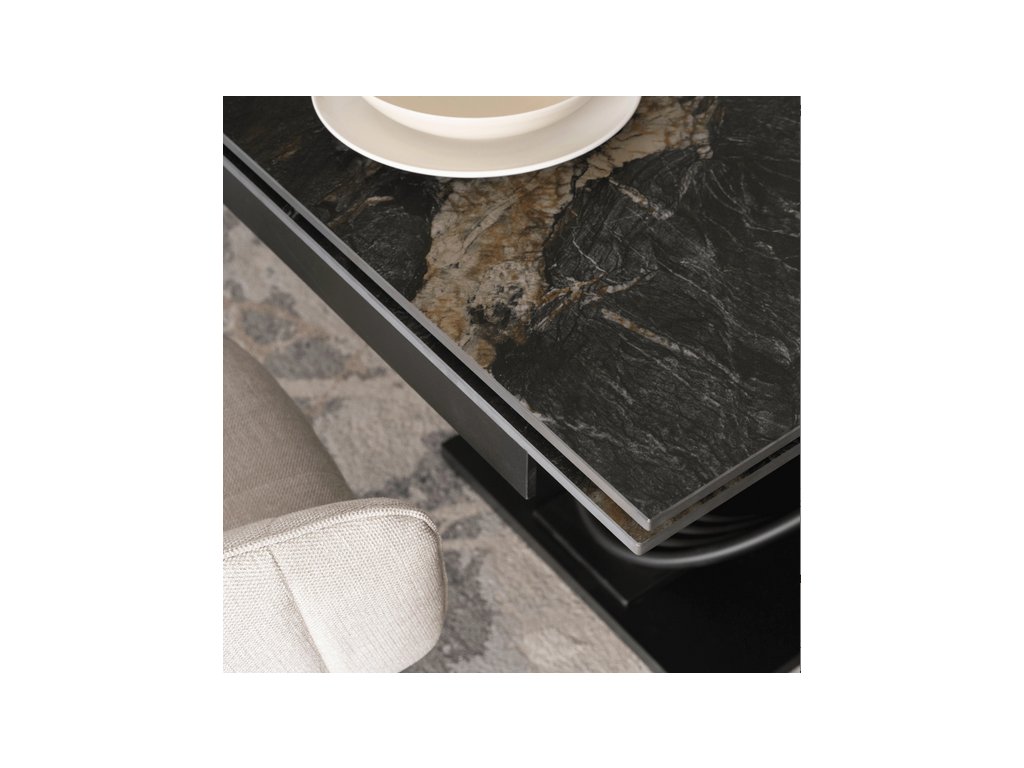Rozkladací stôl RONNY je kombináciou nadčasového dizajnu a praktického riešenia pre každodenné stolovanie aj špeciálne príležitosti. Elegantný kontrast čiernej keramickej dosky a čieneho kovového korpusu dodáva stolu luxusný vzhľad a robí z neho dominantný prvok vašej jedálne.