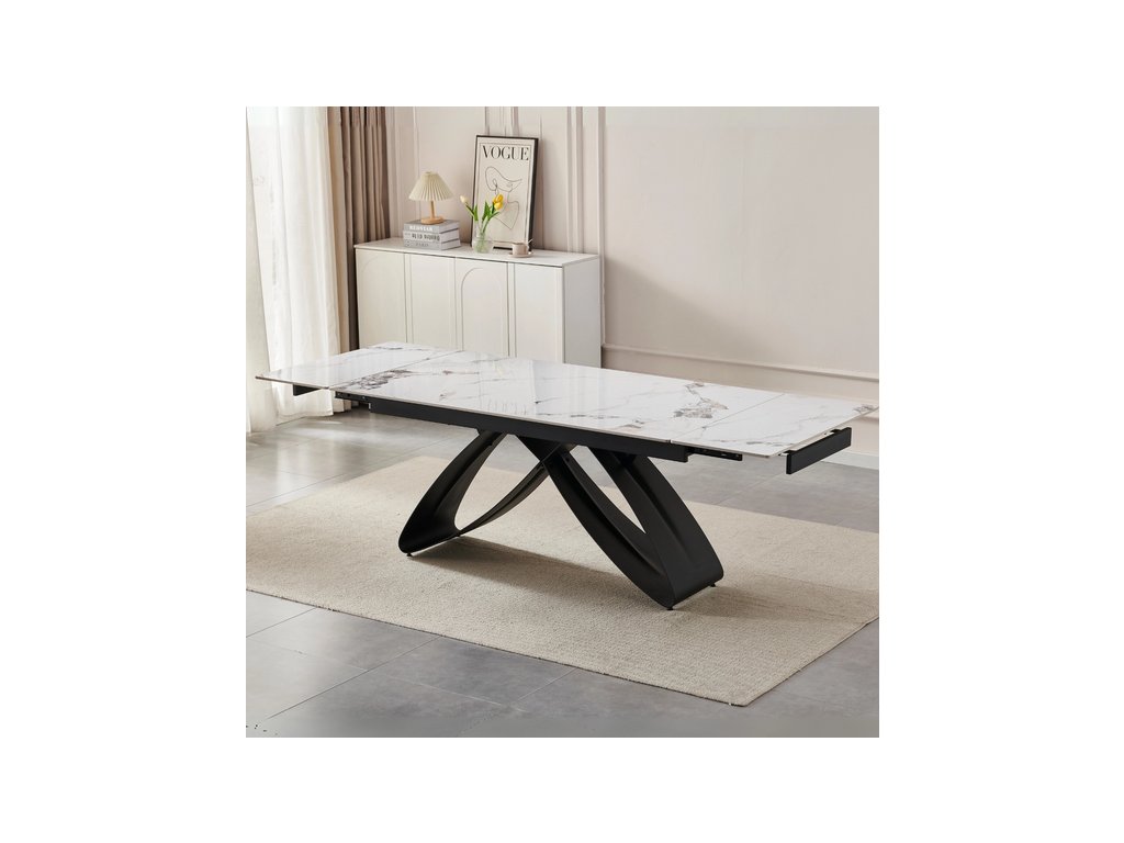 Doska stola z kvalitného bieleho mramoru je odolná voči poškriabaniu, teplu a ľahko sa udržiava. Stabilná kovová konštrukcia v čiernej farbe zabezpečuje pevnosť a dlhú životnosť stola. Rozkladacia funkcia umožňuje zväčšiť dĺžku stola z 160 cm až na 240 cm, čo poskytuje dostatok priestoru pri rodinných stretnutiach, večeriach s priateľmi alebo oslavách.