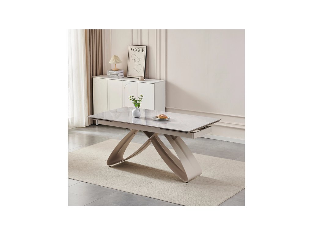 Rozkladací jedálenský stôl MATEO v kombinácii sivý mramor a kašmirová konštrukcia prináša do interiéru luxusný a nadčasový vzhľad. Tento stôl spája eleganciu, odolnosť a praktickosť, čo z neho robí ideálny doplnok do moderných jedální a kuchýň.