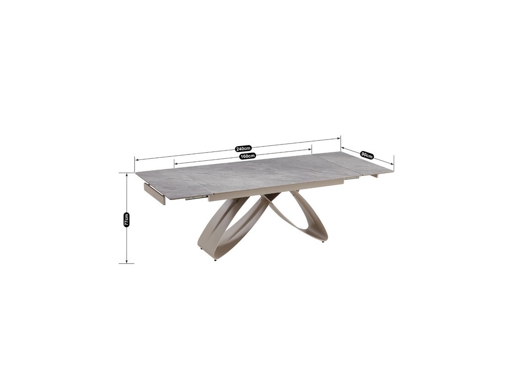 Doska stola z kvalitného bieleho mramoru je odolná voči poškriabaniu, teplu a ľahko sa udržiava. Stabilná kovová konštrukcia v kašmirovej farbe zabezpečuje pevnosť a dlhú životnosť stola. Rozkladacia funkcia umožňuje zväčšiť dĺžku stola z 160 cm až na 240 cm, čo poskytuje dostatok priestoru pri rodinných stretnutiach, večeriach s priateľmi alebo oslavách.