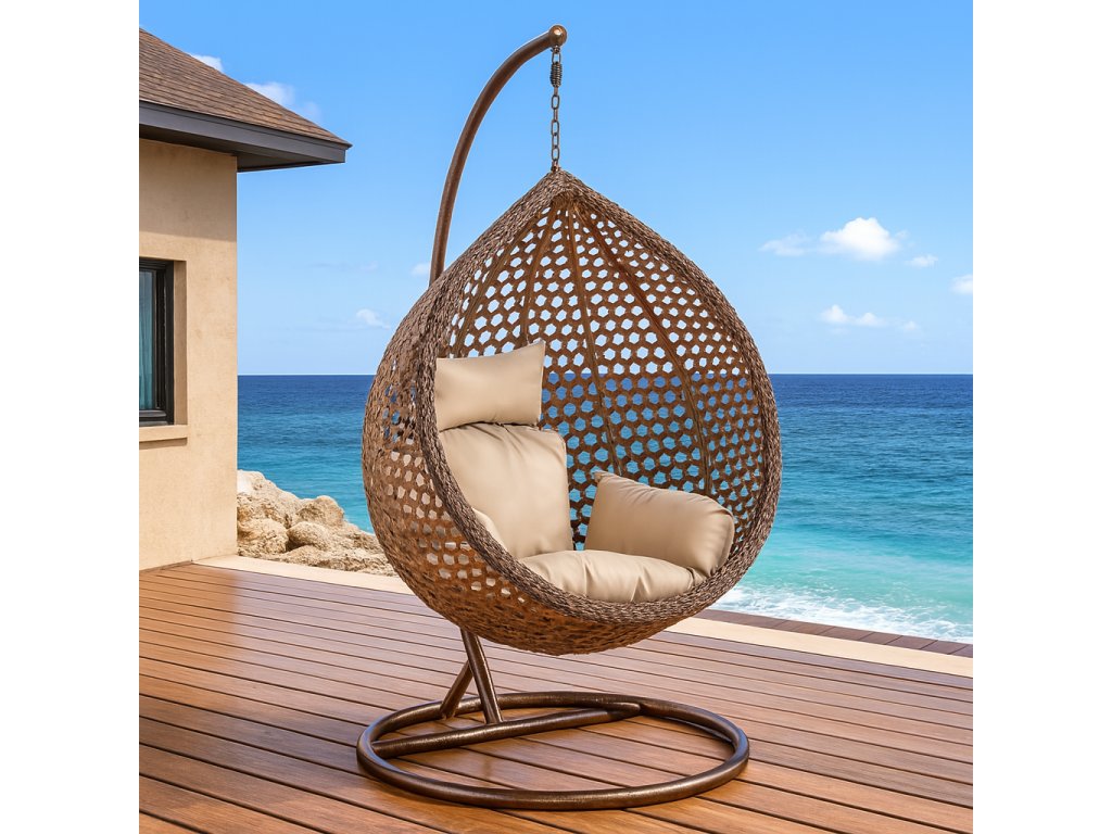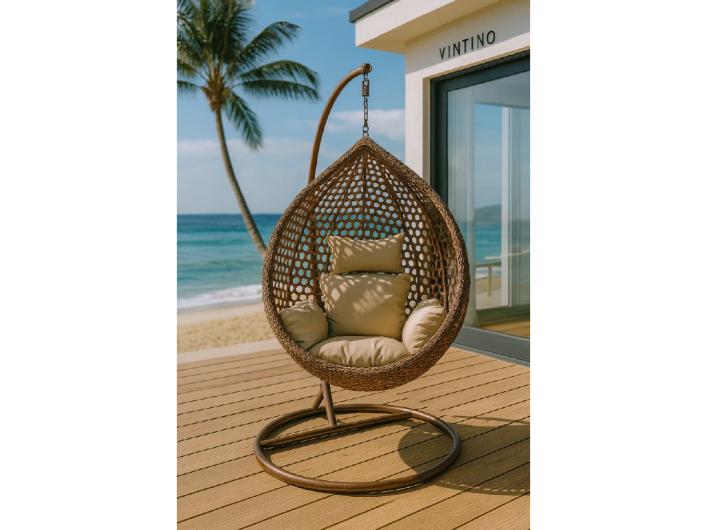 Objavte pohodlie a štýl so závesným hojdacím kreslom PAULA, ktoré sa stane dizajnovým skvostom vašej terasy, balkóna aj záhrady. Toto ratanové kreslo typu kokon v elegantnom hnedom prevedení s luxusným béžovým vankúšom je ideálne na relaxáciu počas slnečných dní aj večerného oddychu.