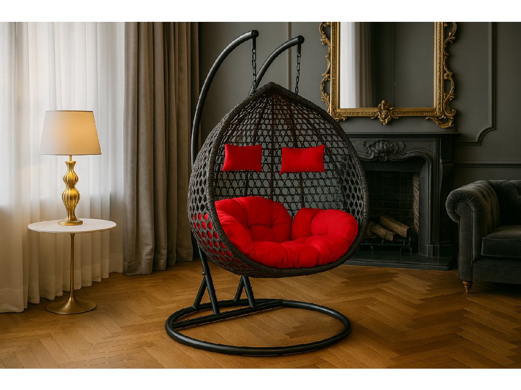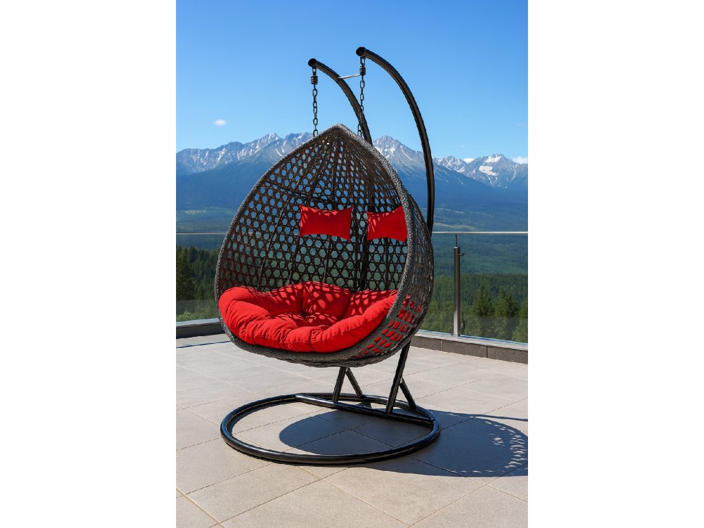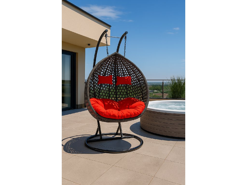 Objavte pohodlie a štýl so závesným hojdacím dvojkreslom VENUS, ktoré sa stane dizajnovým skvostom vašej terasy, balkóna aj záhrady. Toto ratanové kreslo typu kokon v elegantnom čiernom prevedení s luxusným červeným vankúšom je ideálne na relaxáciu počas slnečných dní aj večerného oddychu.