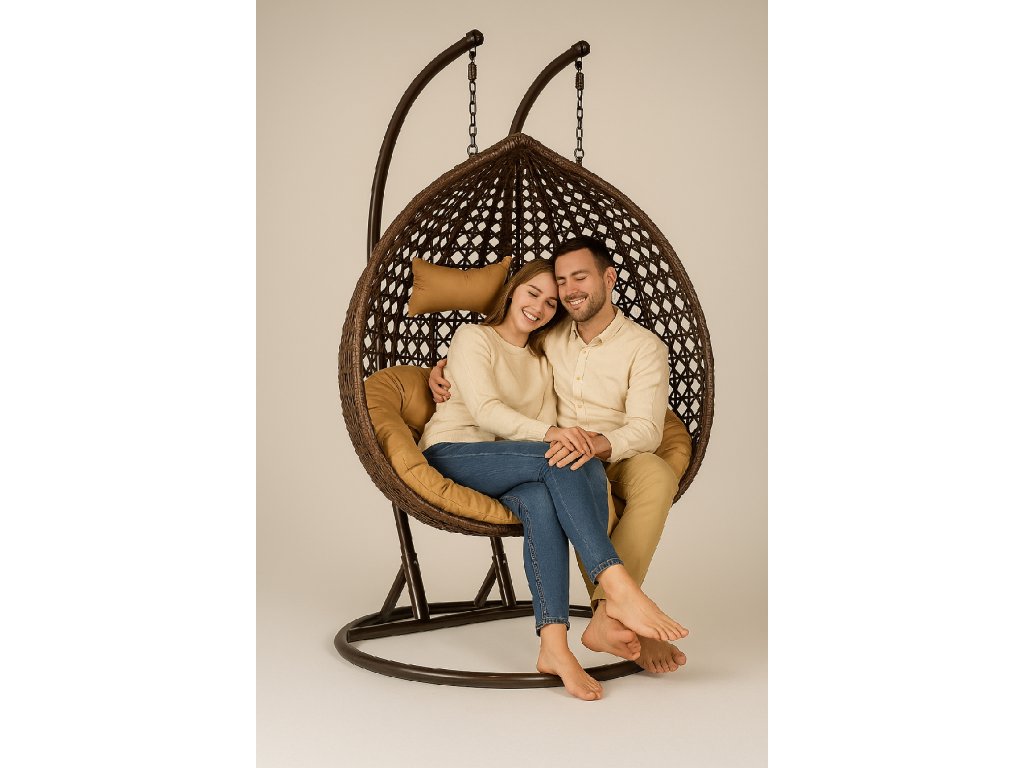 Závesné hojdacie dvojkreslo VIVIEN – ratanové kreslo typu kokon s hnedou robustnou konštrukciou a pohodlným vankúšom. Ideálne na terasu, záhradu, balkón, zimnú záhradu aj interiér. Štýlový doplnok pre dokonalý relax a pohodlie.