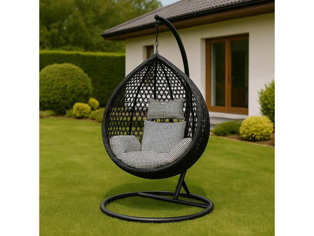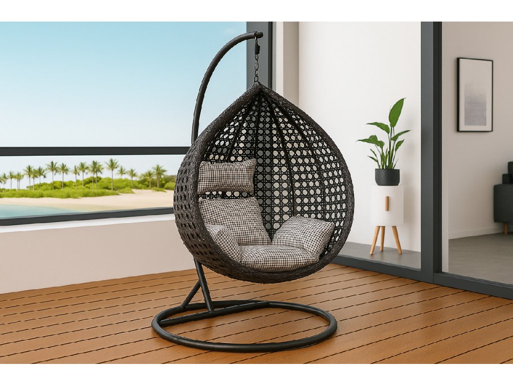 Objavte pohodlie a štýl so závesným hojdacím kreslom ANITA, ktoré sa stane dizajnovým skvostom vašej terasy, balkóna aj záhrady. Toto ratanové kreslo typu kokon v elegantnom čiernom prevedení s luxusným čierno-bielym vankúšom je ideálne na relaxáciu počas slnečných dní aj večerného oddychu.