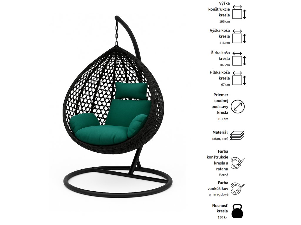 Objavte pohodlie a štýl so závesným hojdacím kreslom ESTER PLUS, ktoré sa stane dizajnovým skvostom vašej terasy, balkóna aj záhrady. Toto ratanové kreslo typu kokon v elegantnom čiernom prevedení s luxusným zeleno-smaragdovým vankúšom je ideálne na relaxáciu počas slnečných dní aj večerného oddychu.