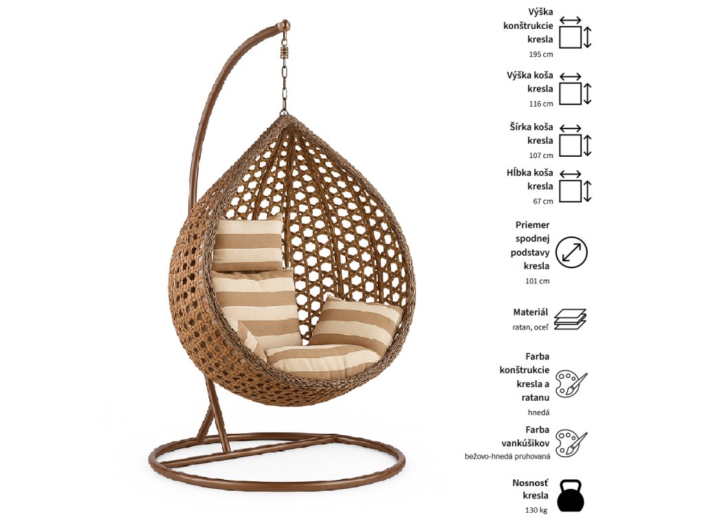 Objavte pohodlie a štýl so závesným hojdacím kreslom PRISCILLA, ktoré sa stane dizajnovým skvostom vašej terasy, balkóna aj záhrady. Toto ratanové kreslo typu kokon v elegantnom hnedom prevedení s luxusným béžovo-bielo pruhovaným vankúšom je ideálne na relaxáciu počas slnečných dní aj večerného oddychu.