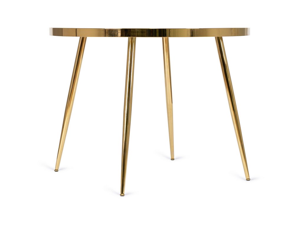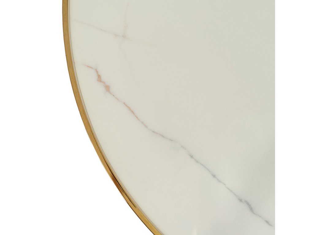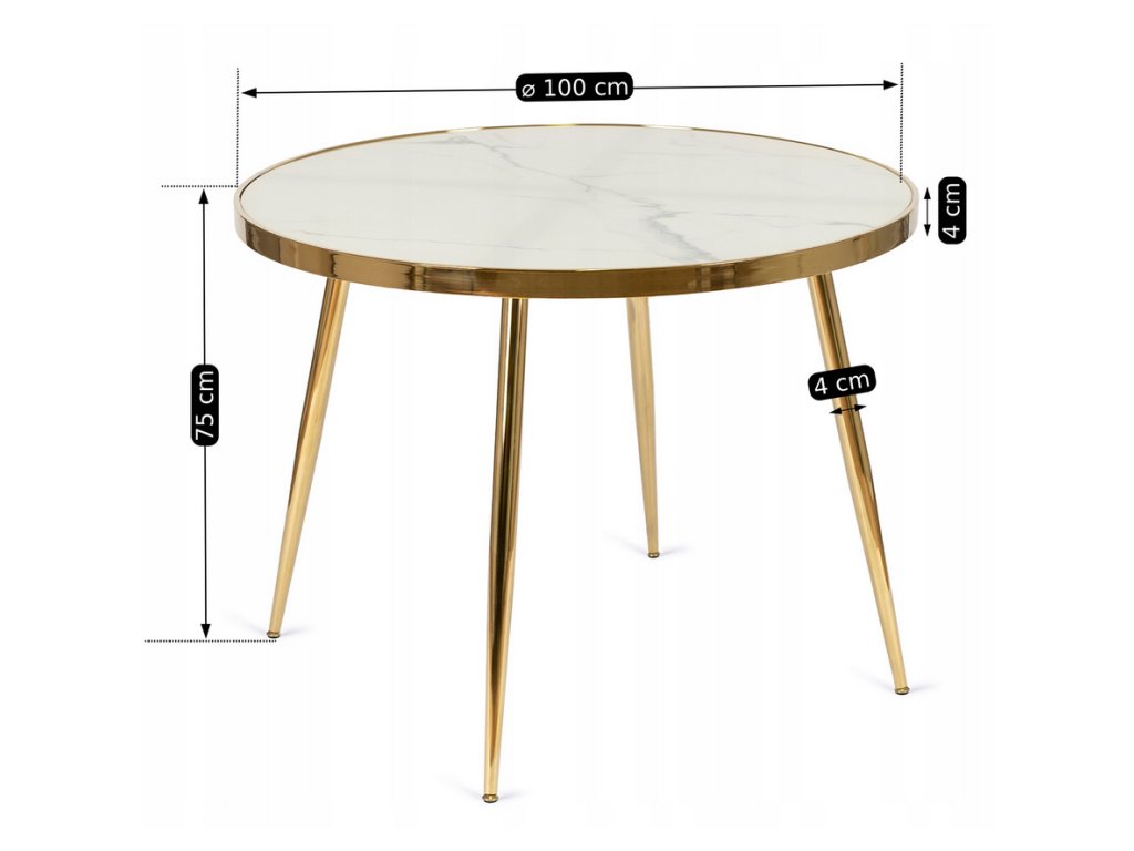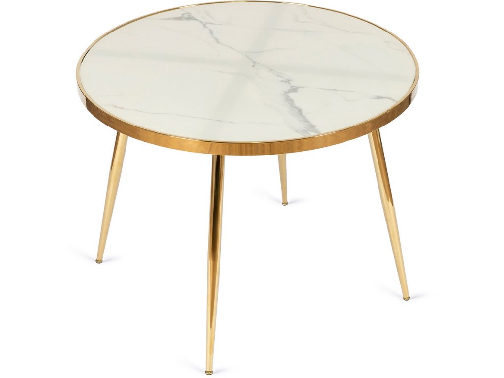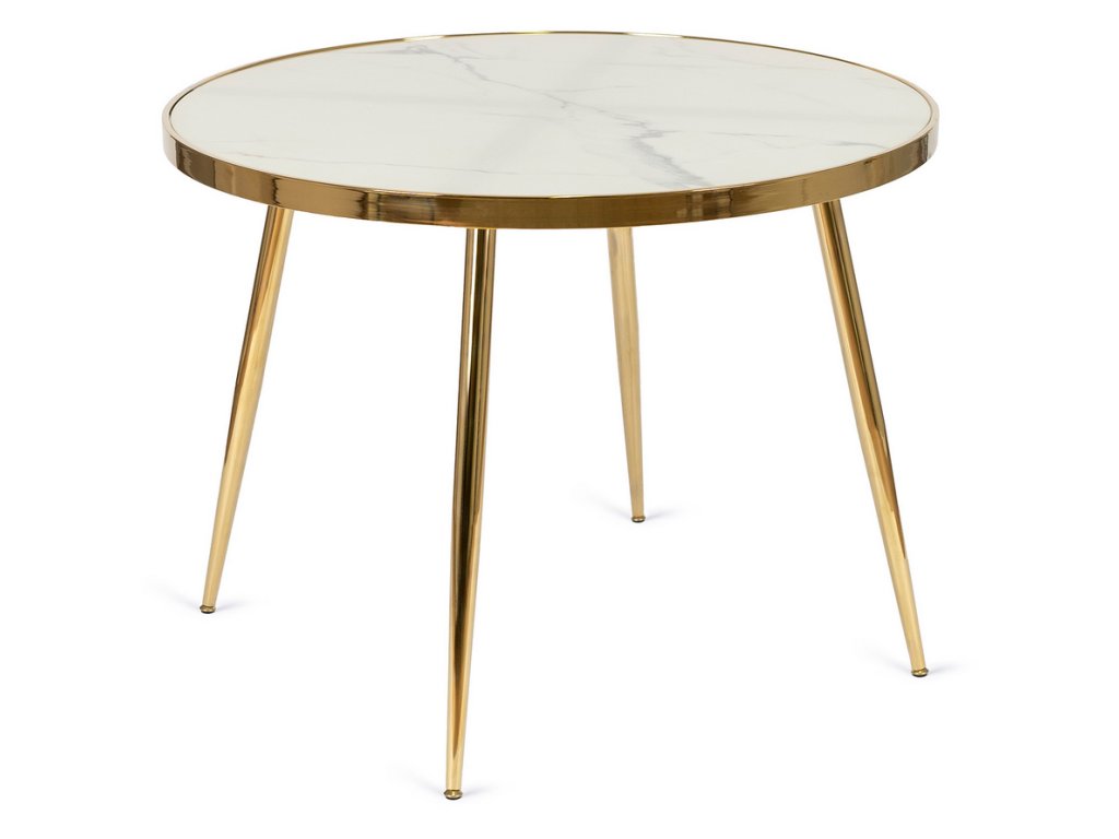 Okrúhly jedálenský stôl AMADORA s priemerom 100 cm má pevnú dosku s povrchom v dekore bieleho mramoru, ktorá pôsobí elegantne a moderne. Zlatá kovová podnož dodáva stolu štýlový a exkluzívny vzhľad, typický pre glamour interiéry.