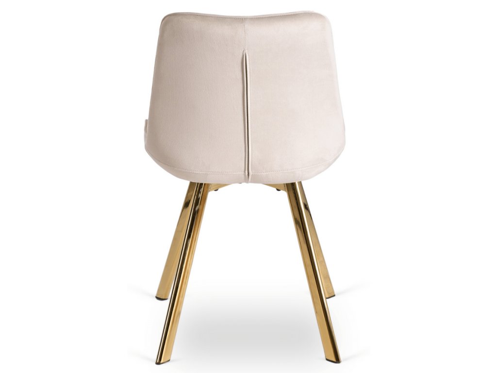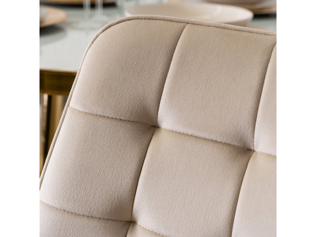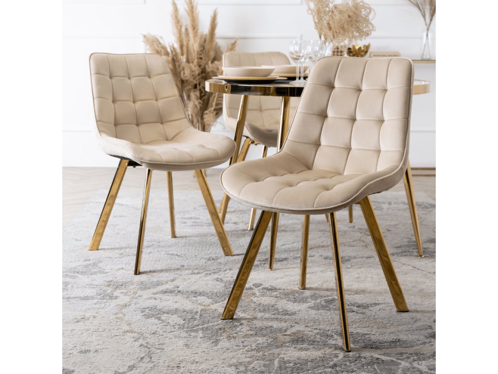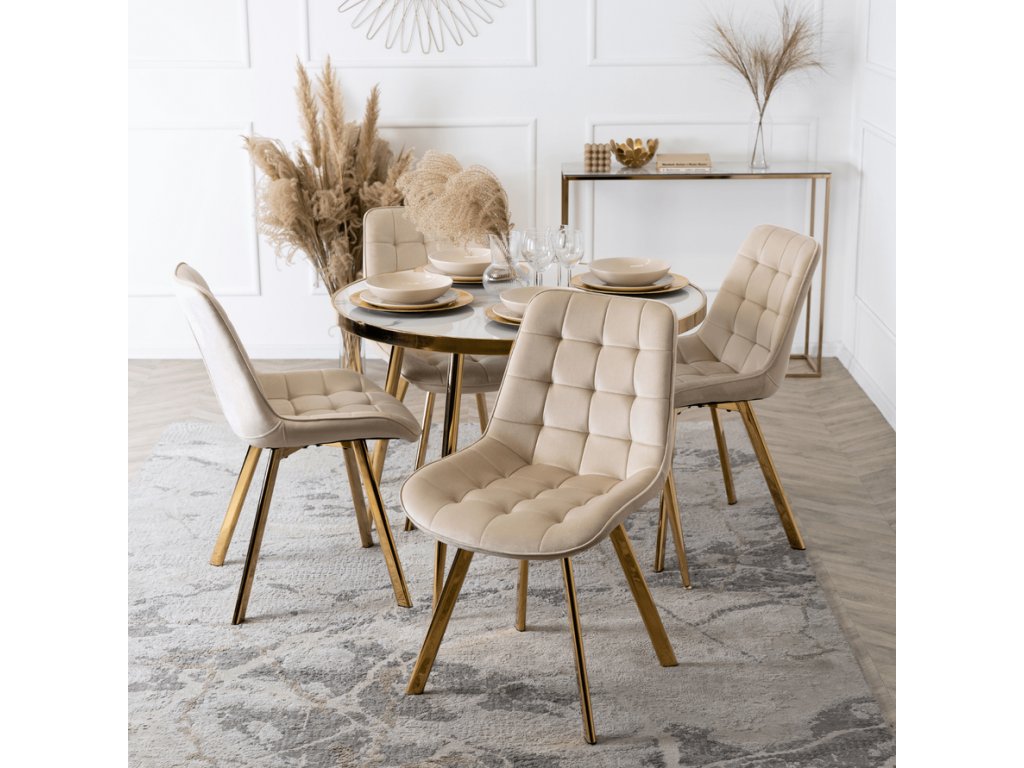 Súčasťou zostavy sú 4 čalúnené stoličky DORIS v krémovej farbe. Mäkké zamatové čalúnenie, elegantné prešívanie a zlaté nohy vytvárajú harmonický a luxusný celok. Stoličky sú nielen krásne, ale aj pohodlné – ideálne na dlhé večere či rodinné posedenia.