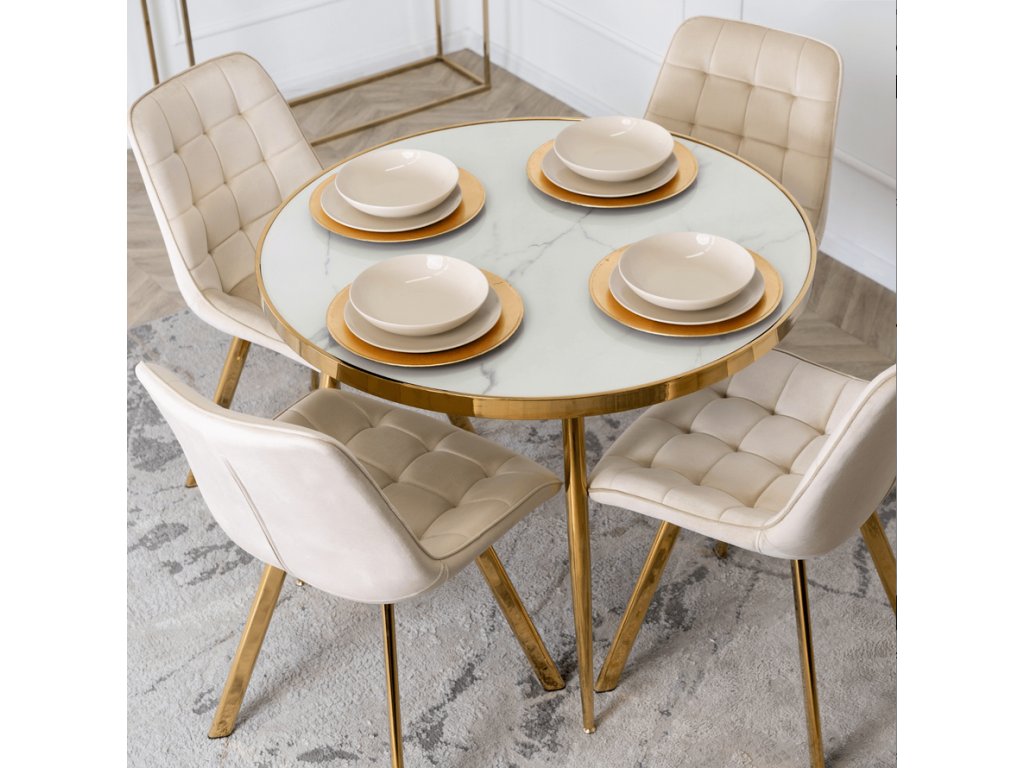 Luxusná jedálenská zostava AMADORA a DORIS v štýle glamour spája eleganciu a moderný dizajn. Okrúhly stôl s efektom bieleho mramoru a zlatou konštrukciou pôsobí štýlovo a nadčasovo. Štyri krémové čalúnené stoličky DORIS zaručia komfortné sedenie a pridajú interiéru jemný dotyk luxusu. Ideálna voľba pre moderné jedálne a obývacie priestory.